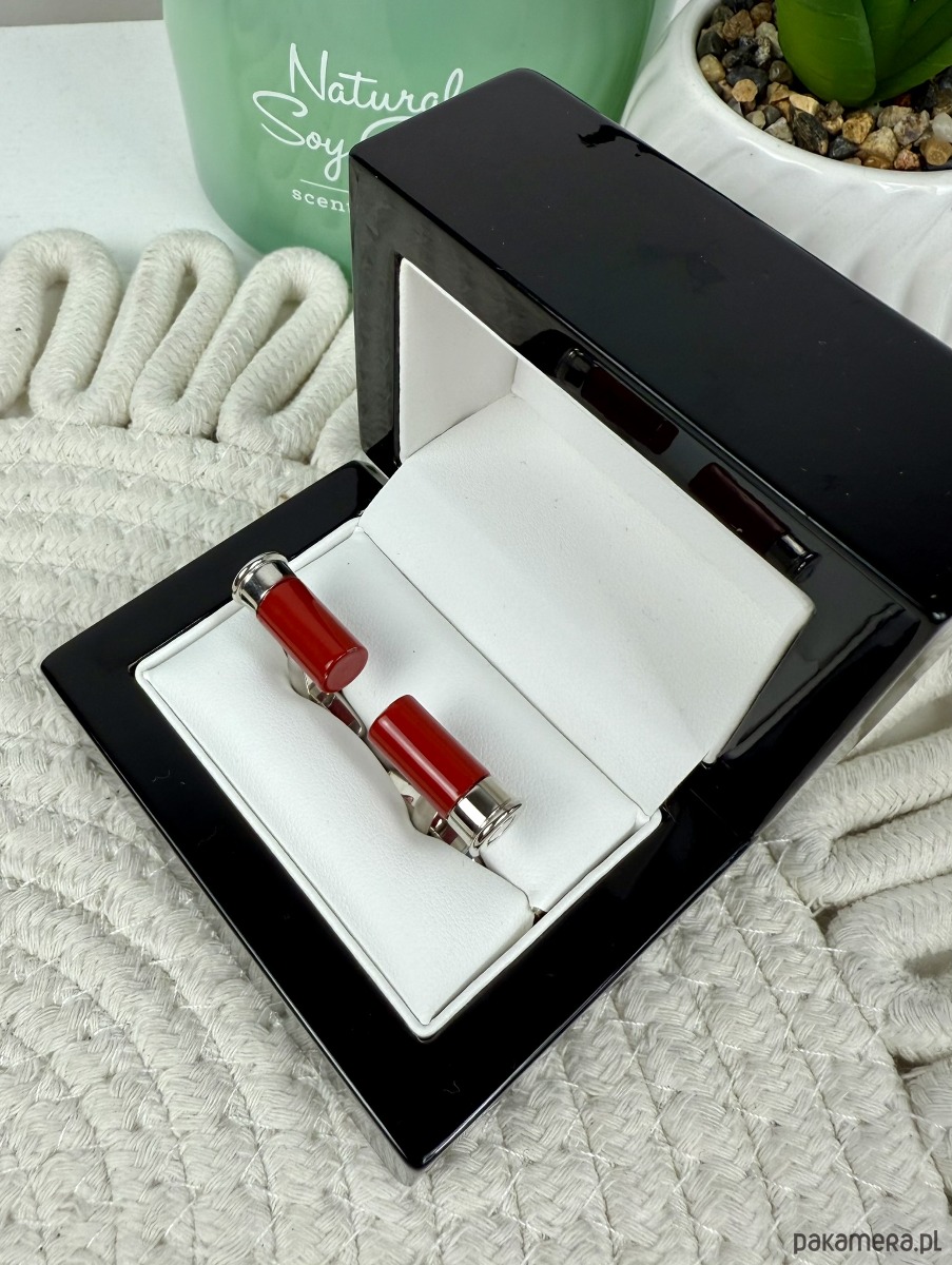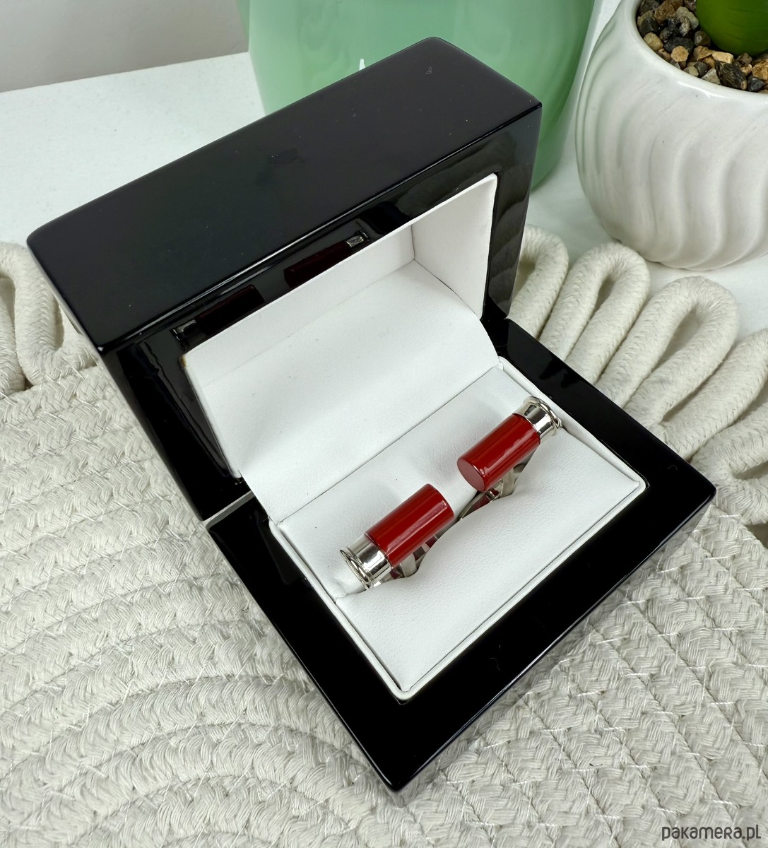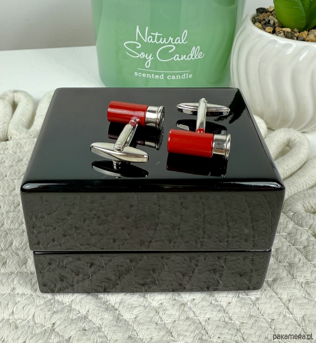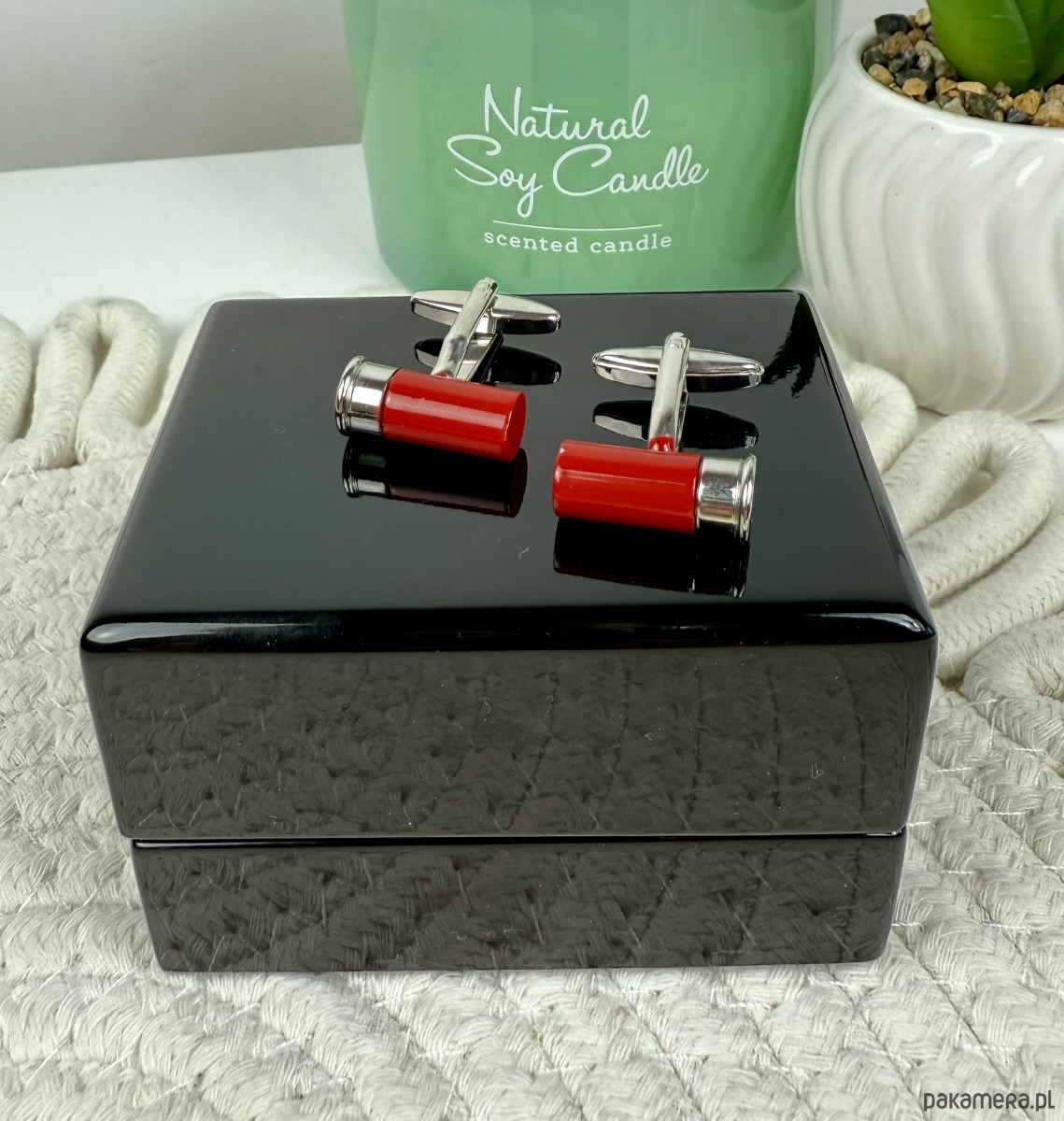 Spinki zapakowane w drewniane pudełko wykończone na wysoki połysk