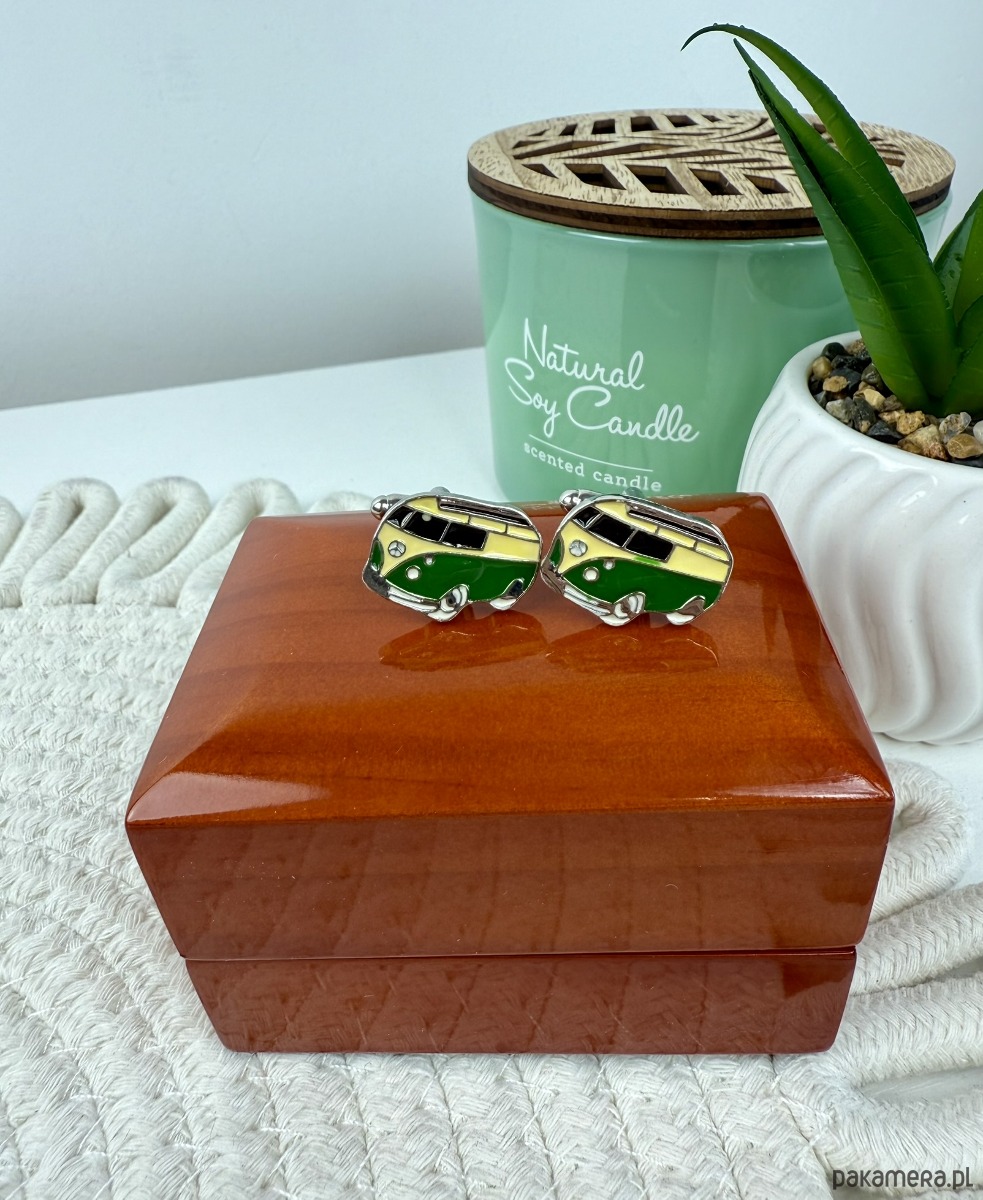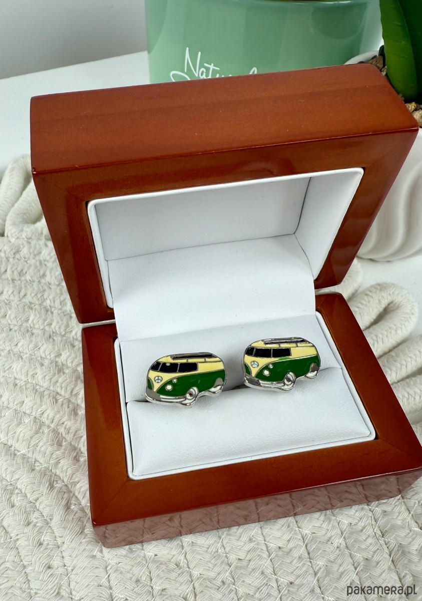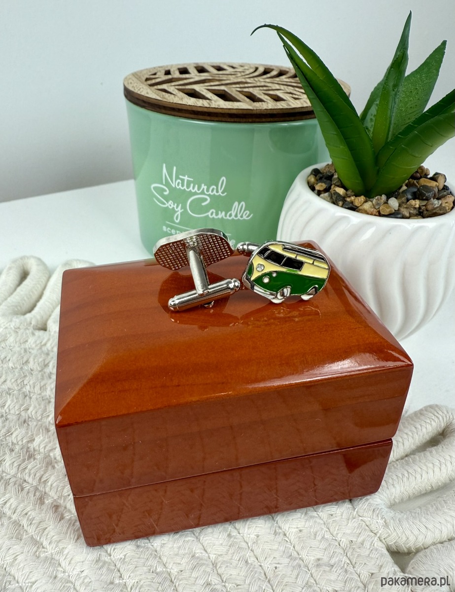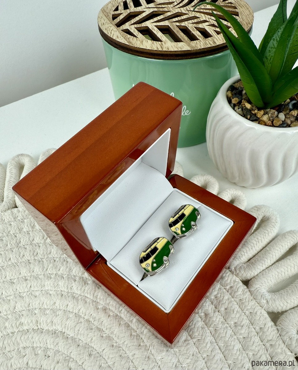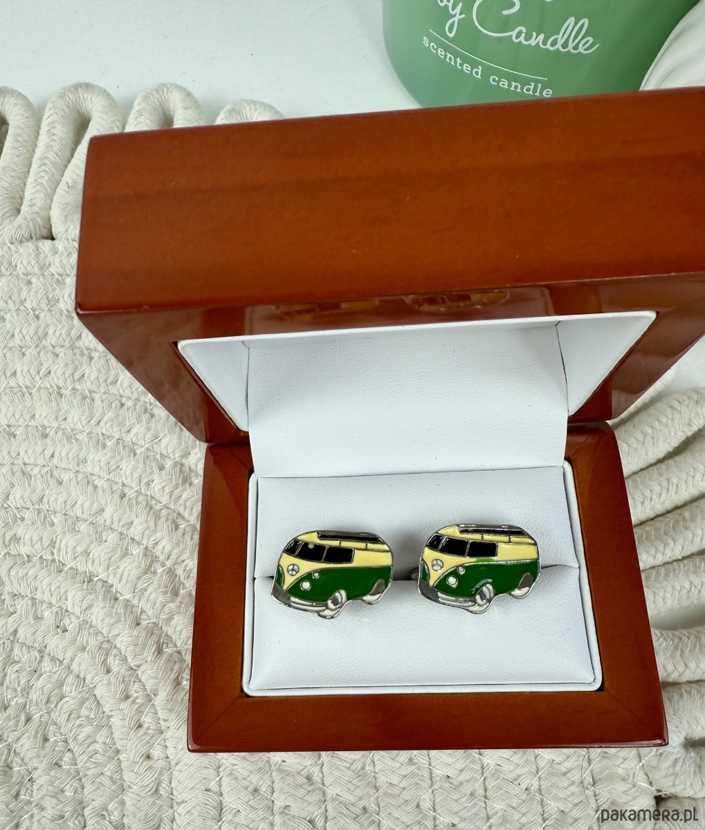 Spinki zapakowane w drewniane pudełko wykończone na wysoki połysk