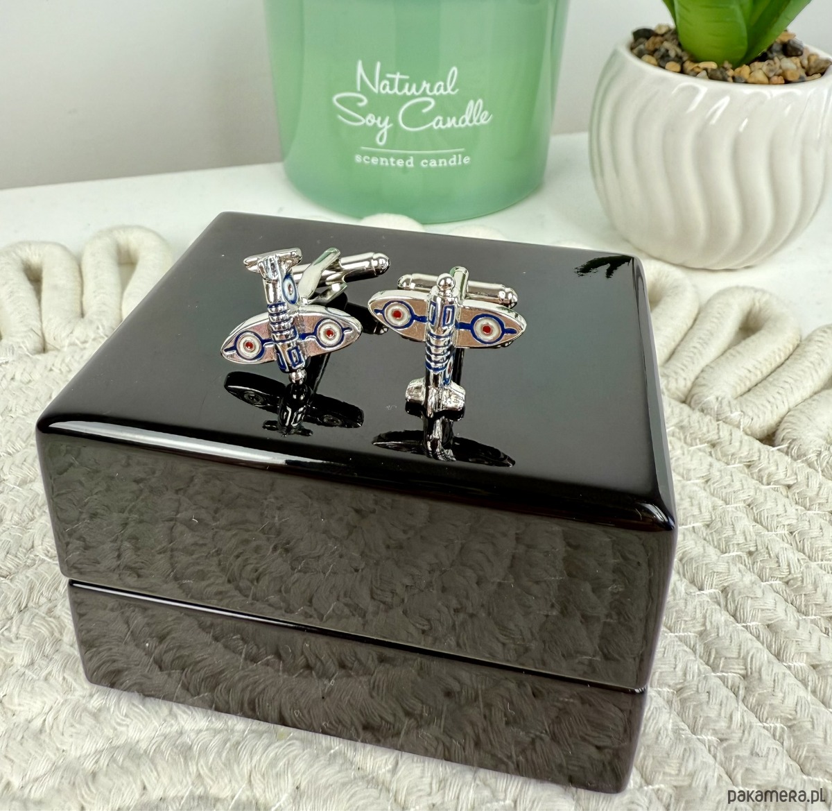 Spinki zapakowane w drewniane pudełko wykończone na wysoki połysk