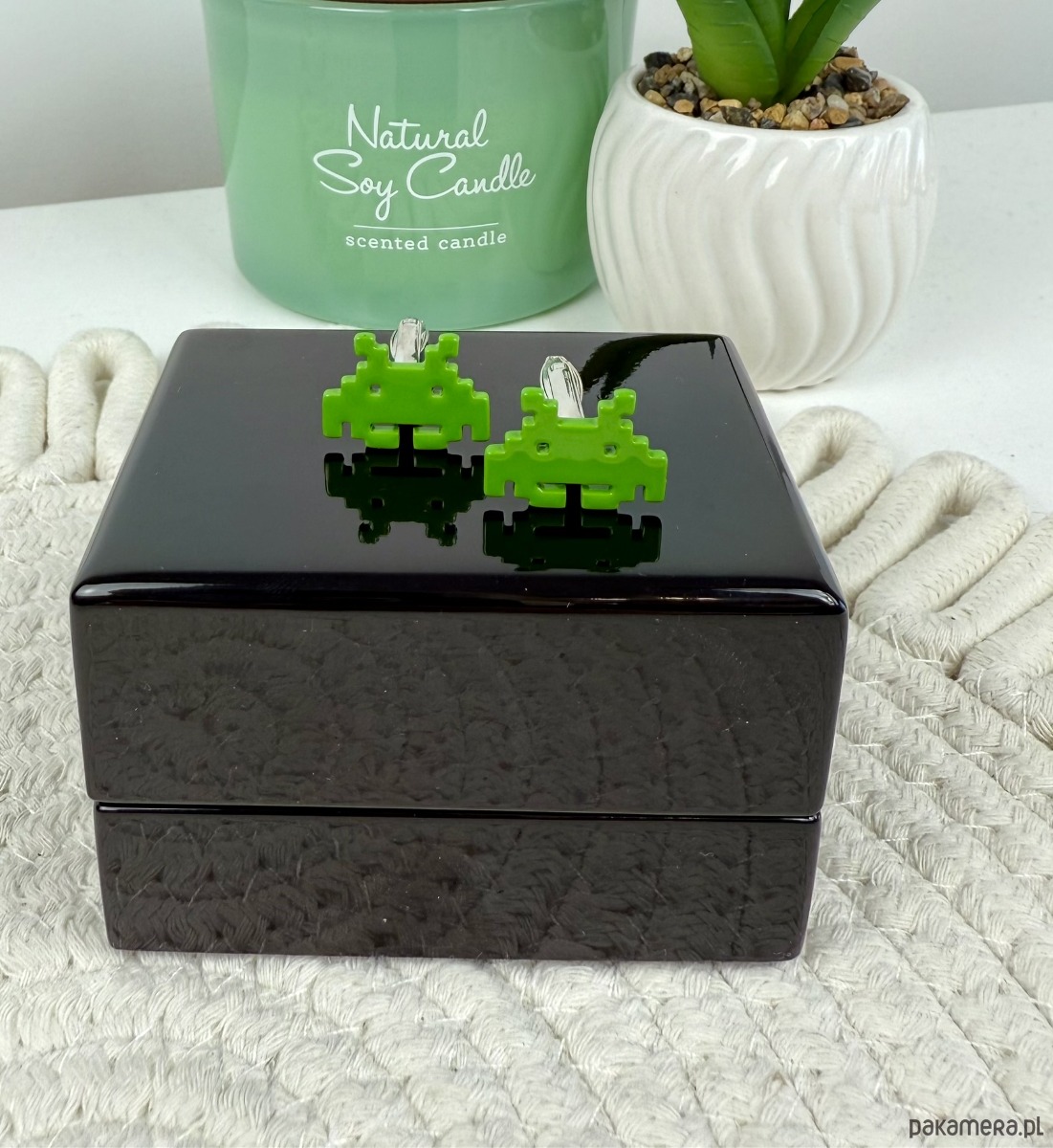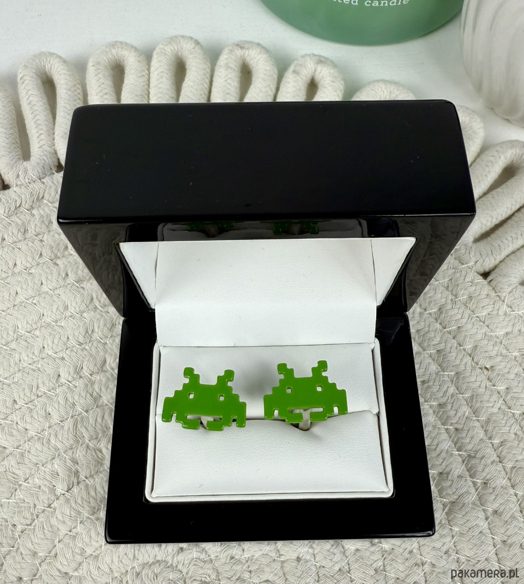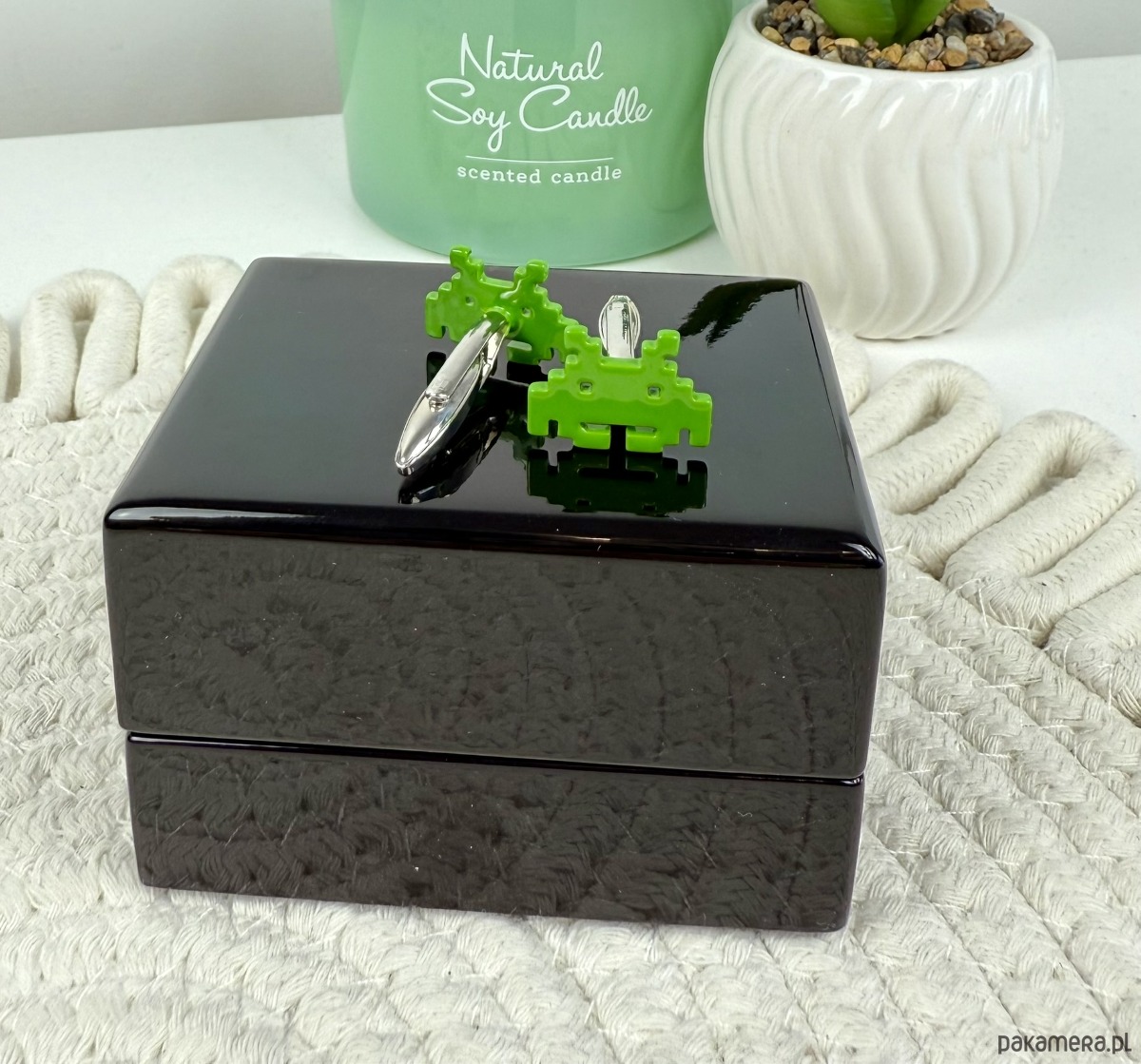 Spinki zapakowane w drewniane pudełko wykończone na wysoki połysk