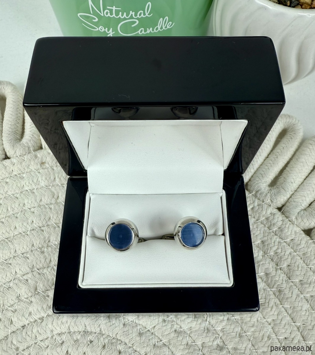 Spinki zapakowane w drewniane pudełko wykończone na wysoki połysk