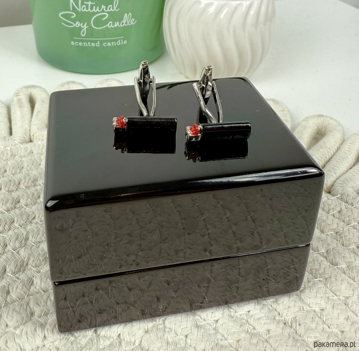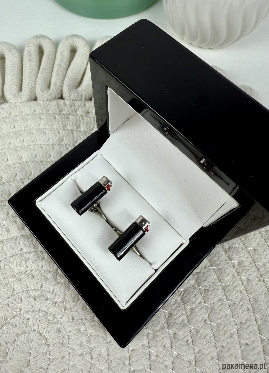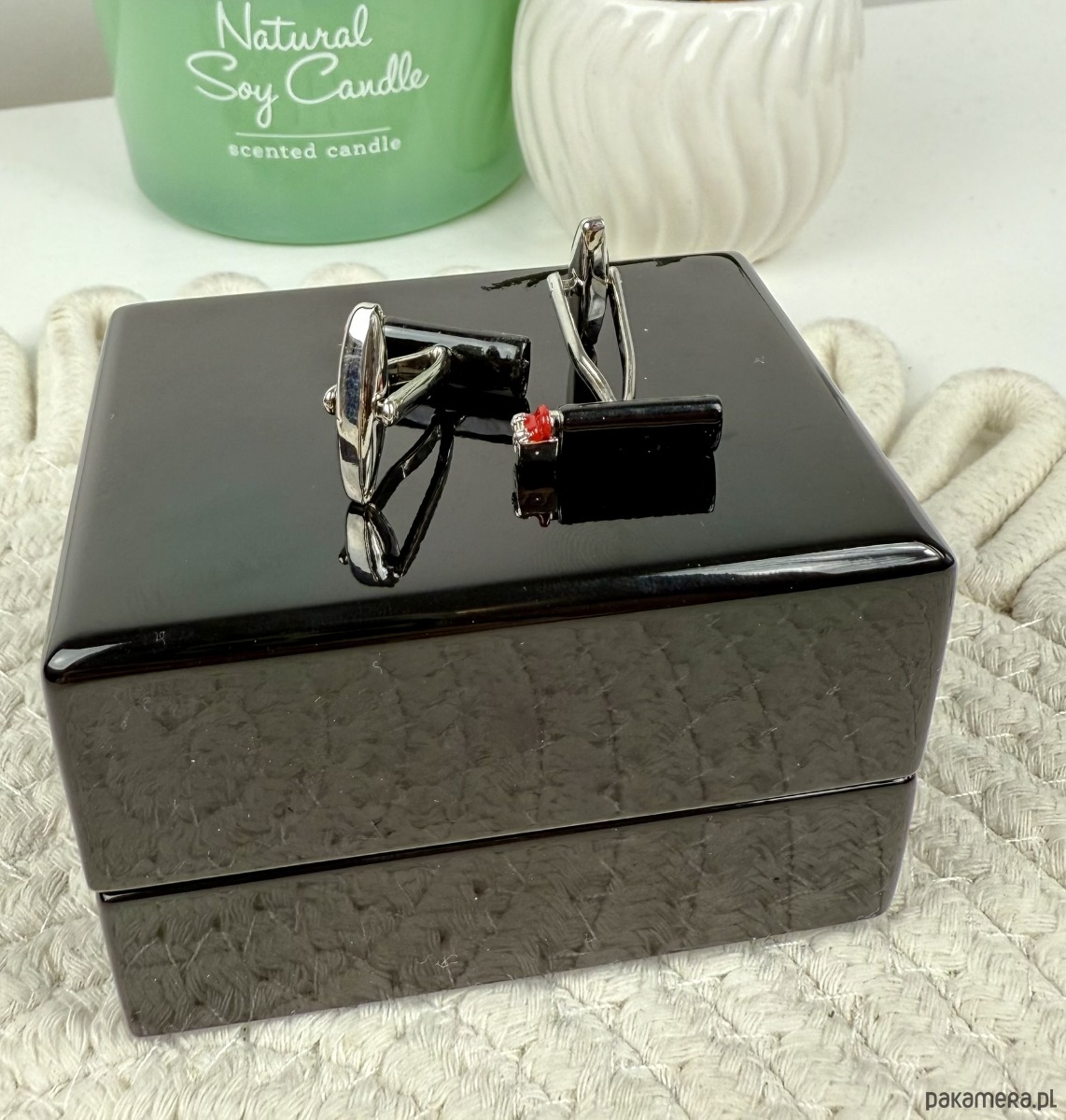 Spinki zapakowane w drewniane pudełko wykończone na wysoki połysk