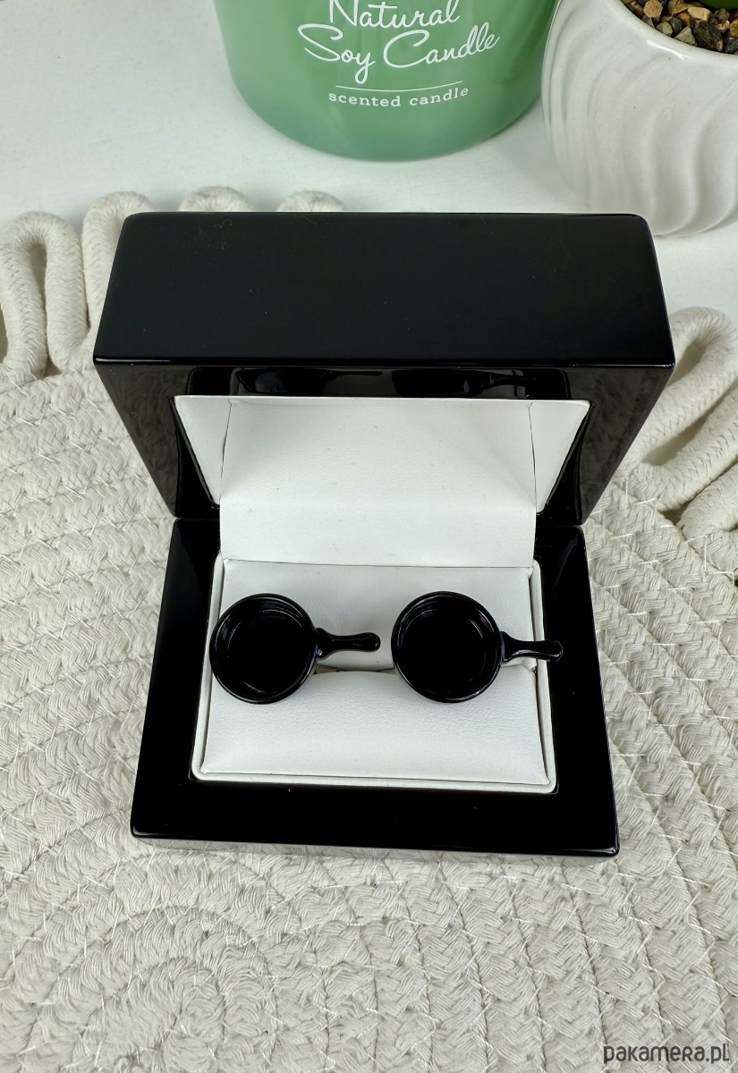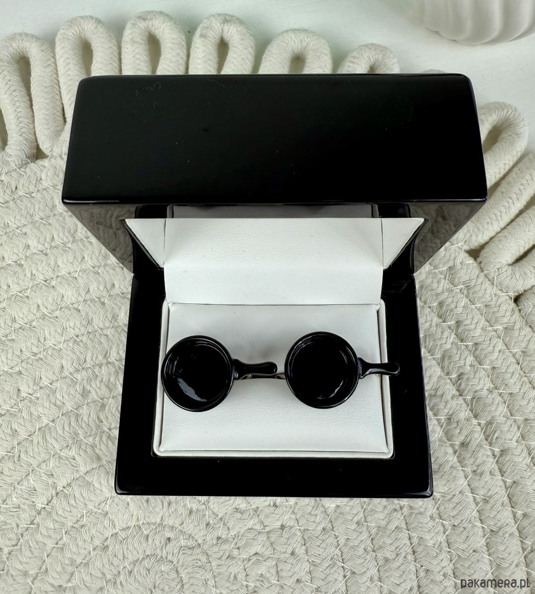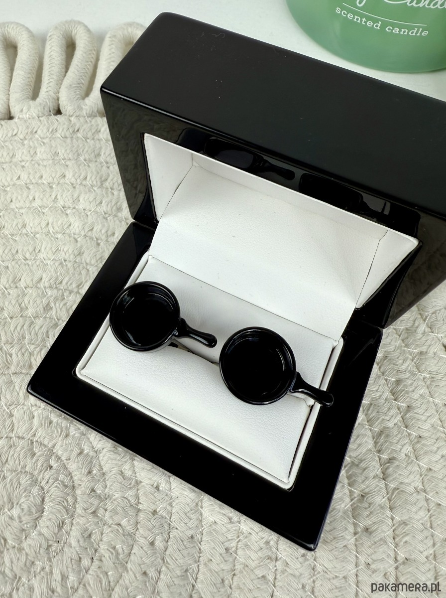 Spinki zapakowane w drewniane pudełko wykończone na wysoki połysk