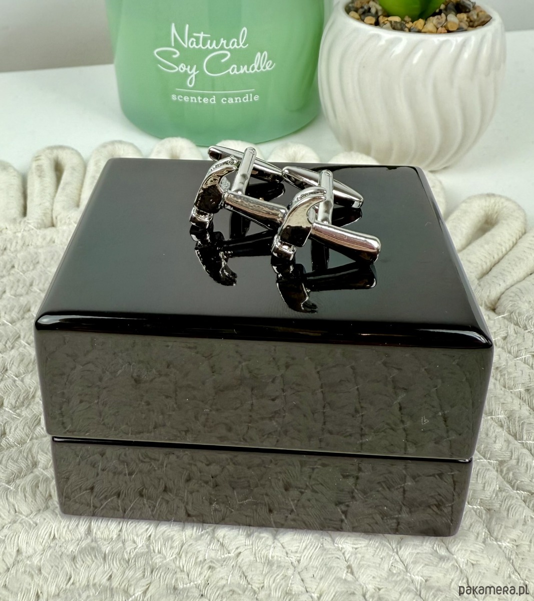 Spinki zapakowane w drewniane pudełko wykończone na wysoki połysk