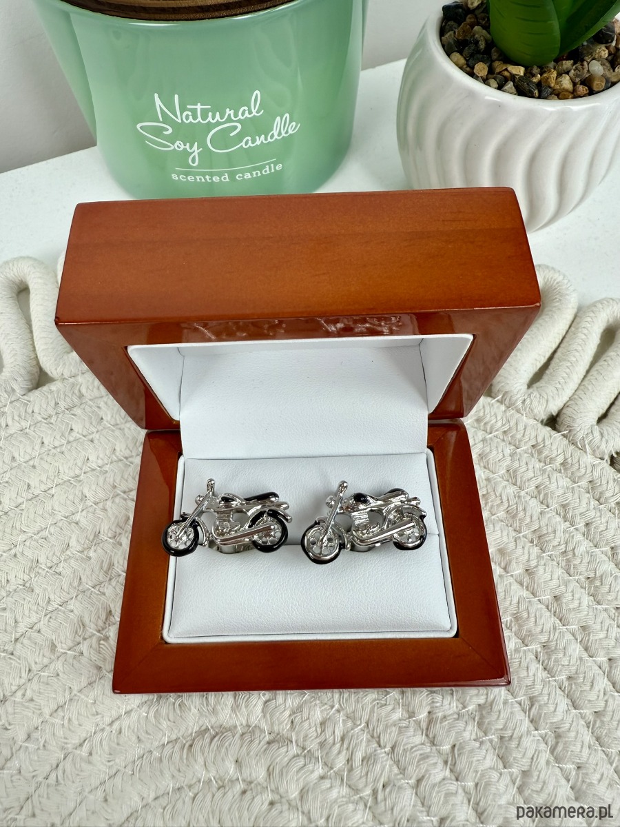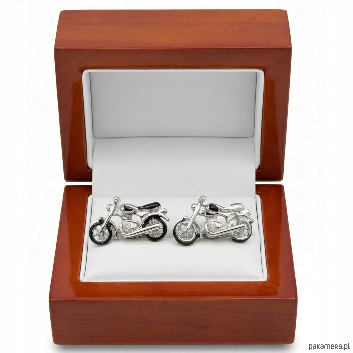 Spinki zapakowane w drewniane pudełko wykończone na wysoki połysk