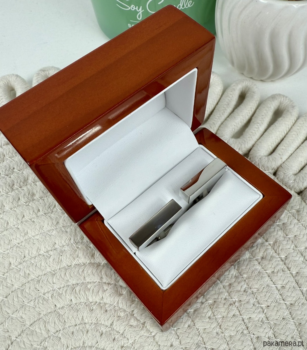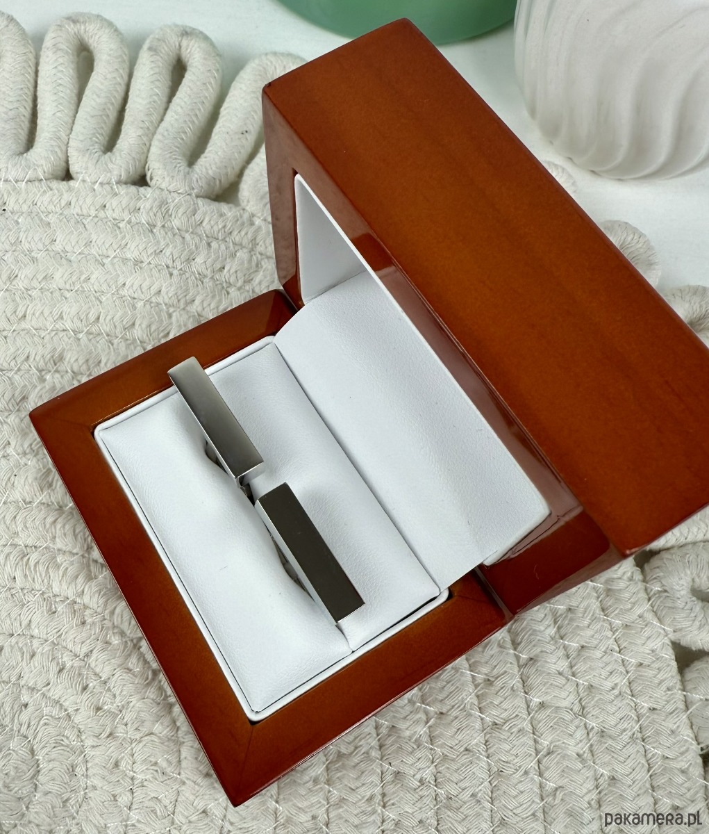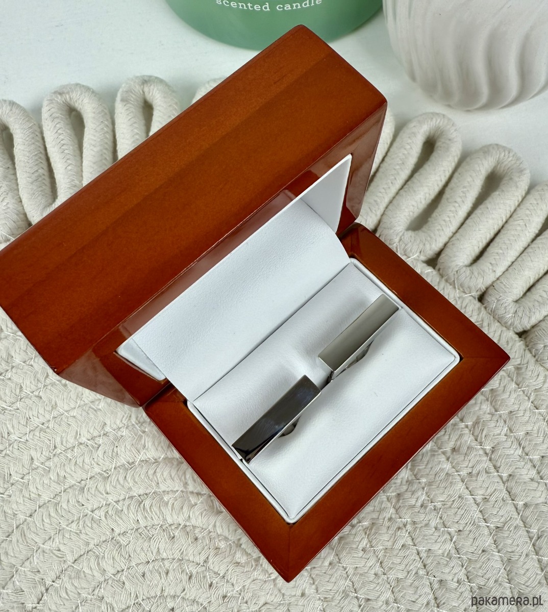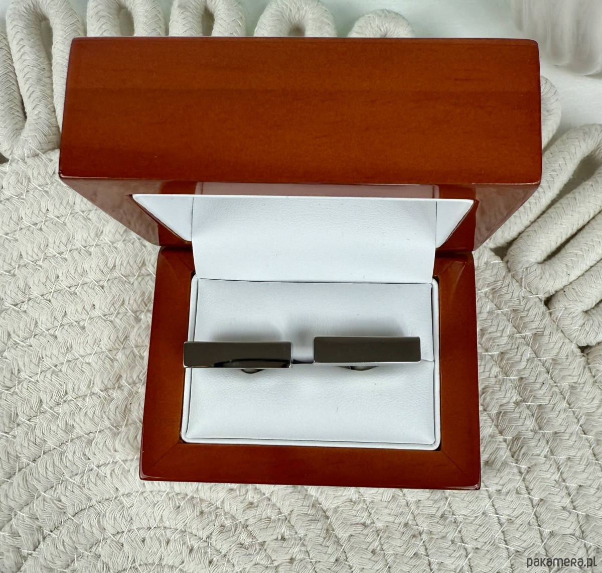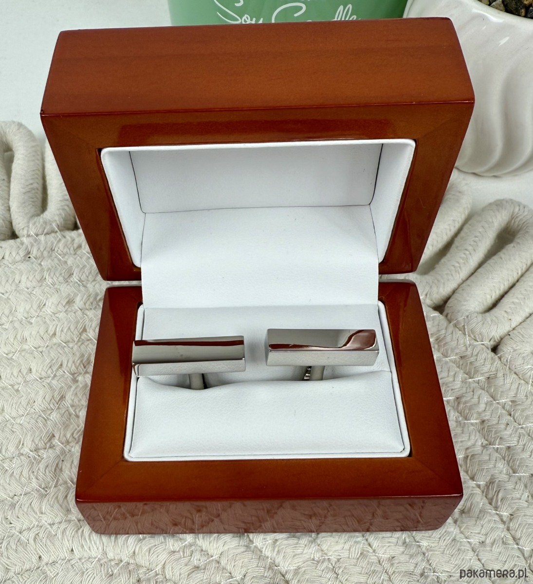 Spinki zapakowane w drewniane pudełko wykończone na wysoki połysk