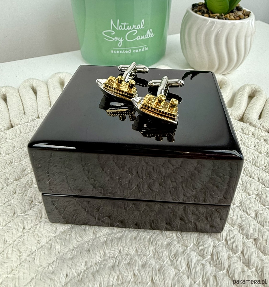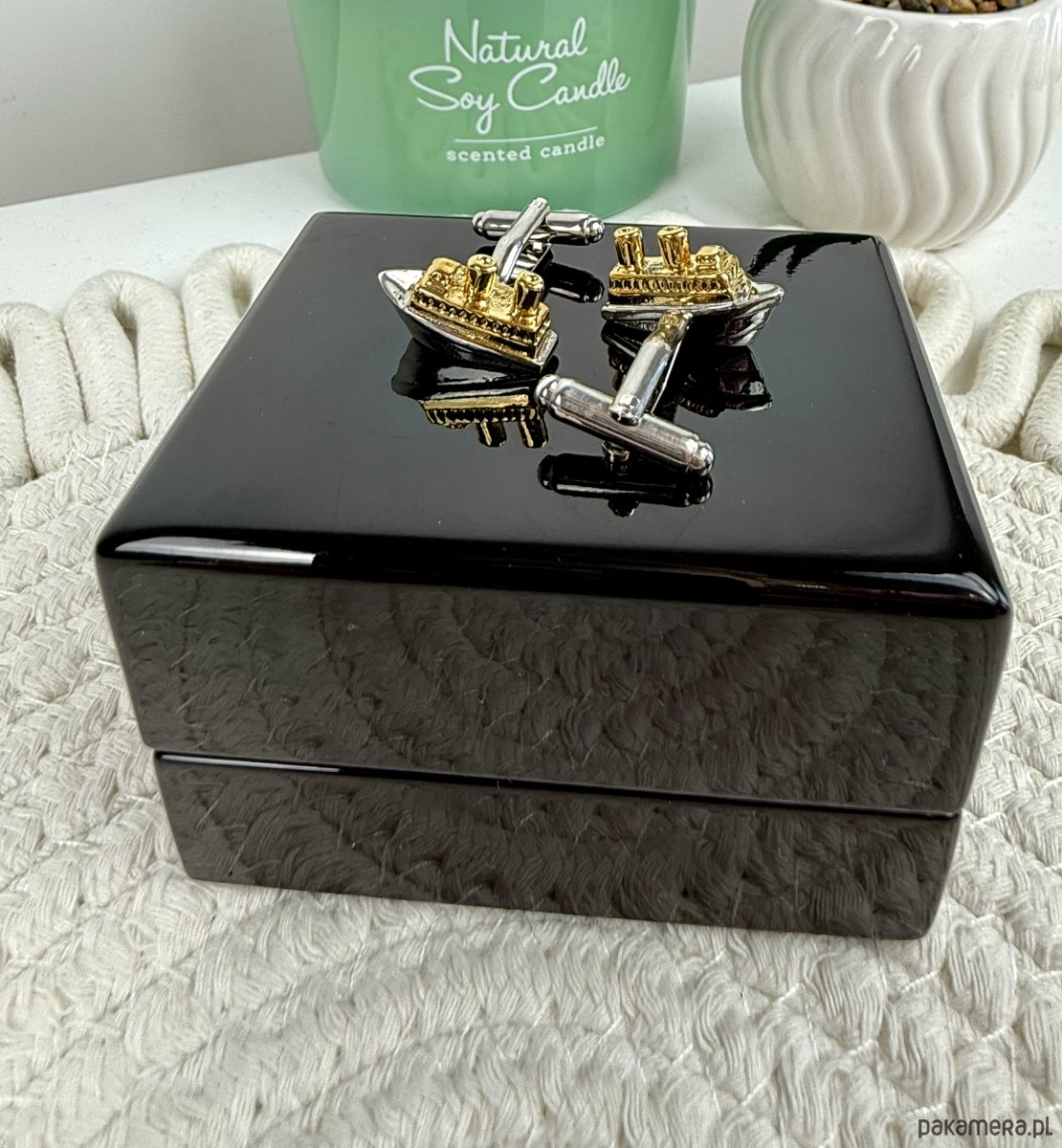 Spinki zapakowane w drewniane pudełko wykończone na wysoki połysk