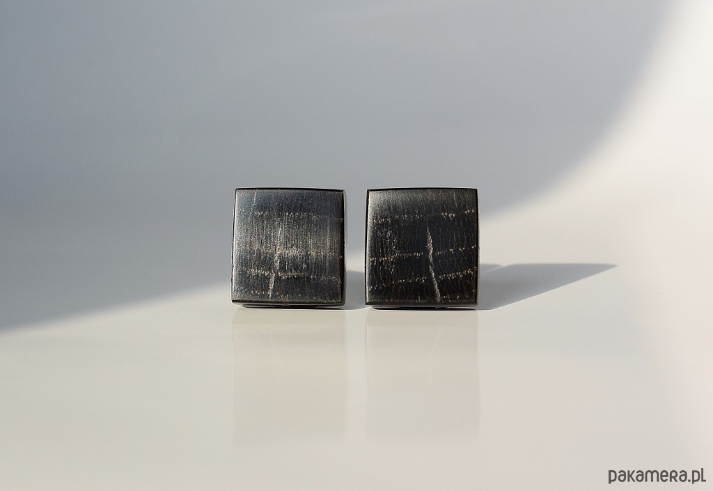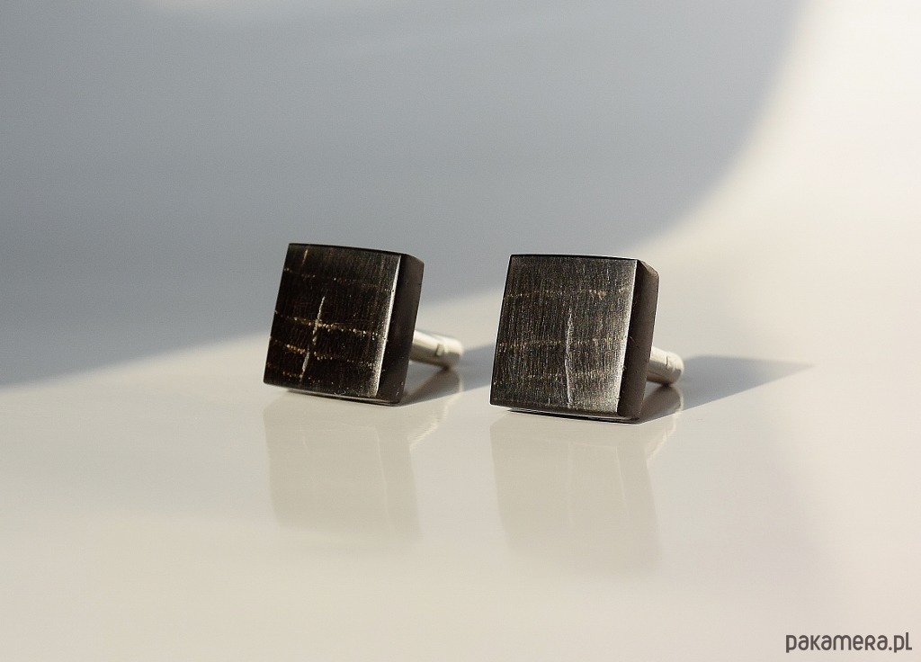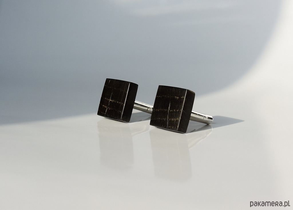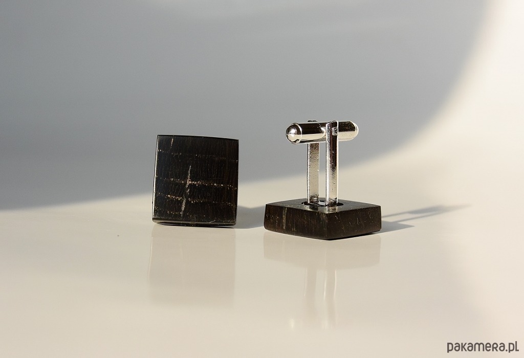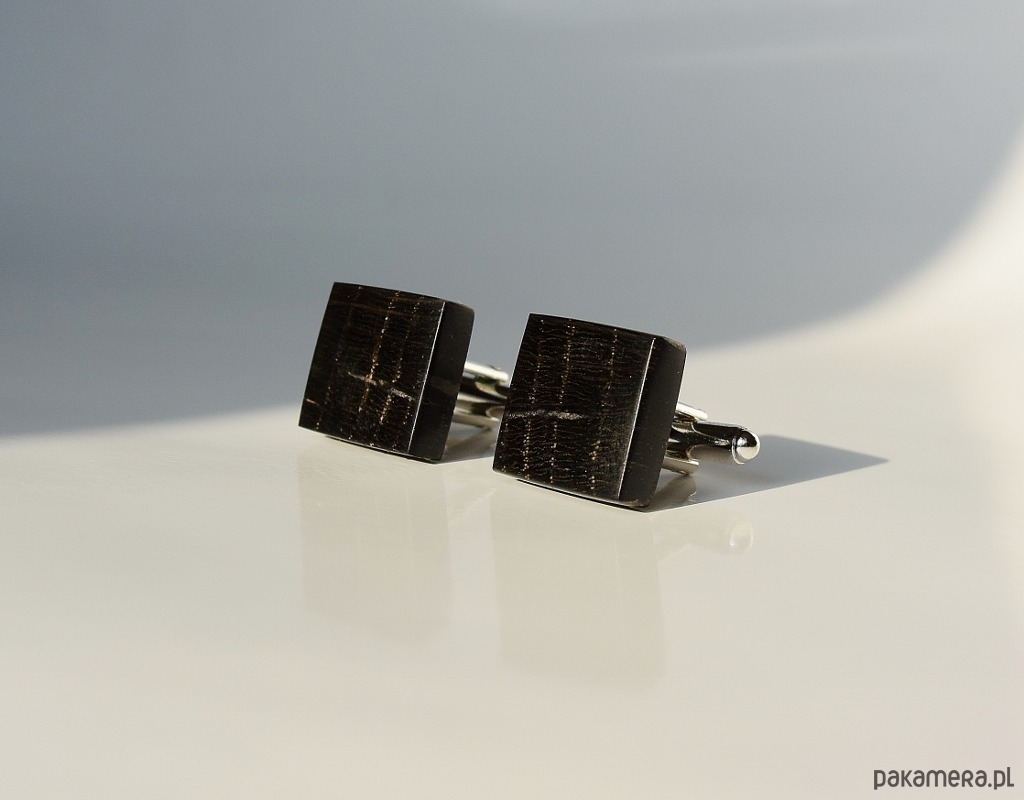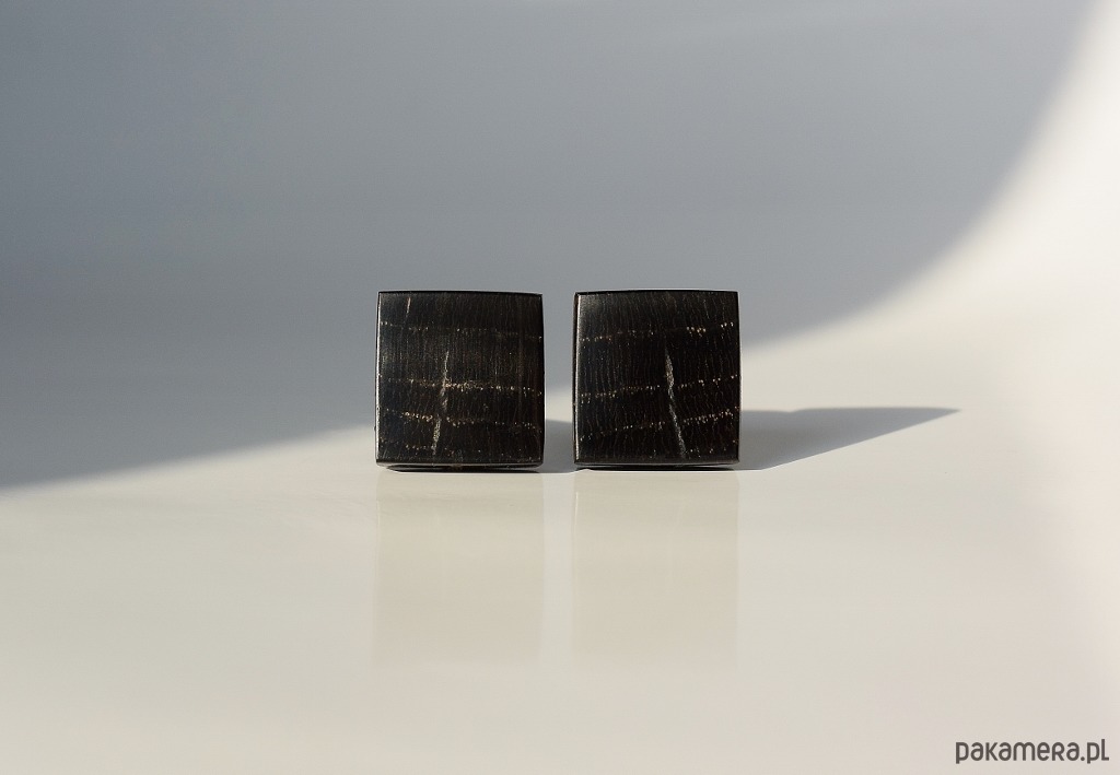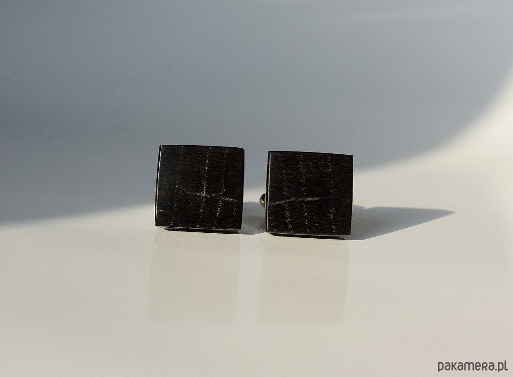 Spinki do mankietów wykonane zostały ręcznie ze stabilizowanego drewna czarnego dębu. Zabezpieczone naturalnymi woskami i wypolerowane, dzięki czemu w dotyku są aksamitne.