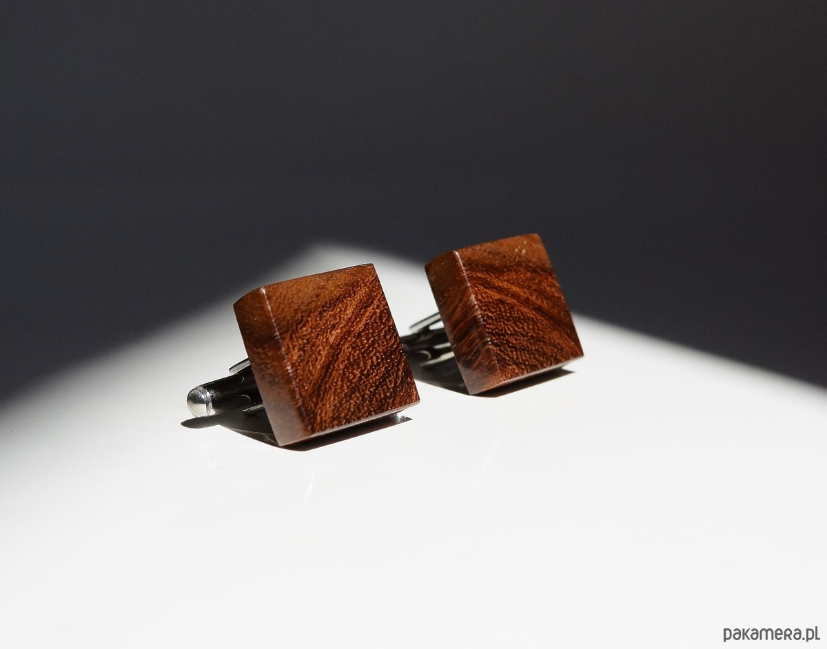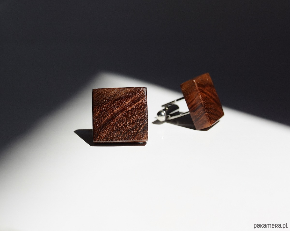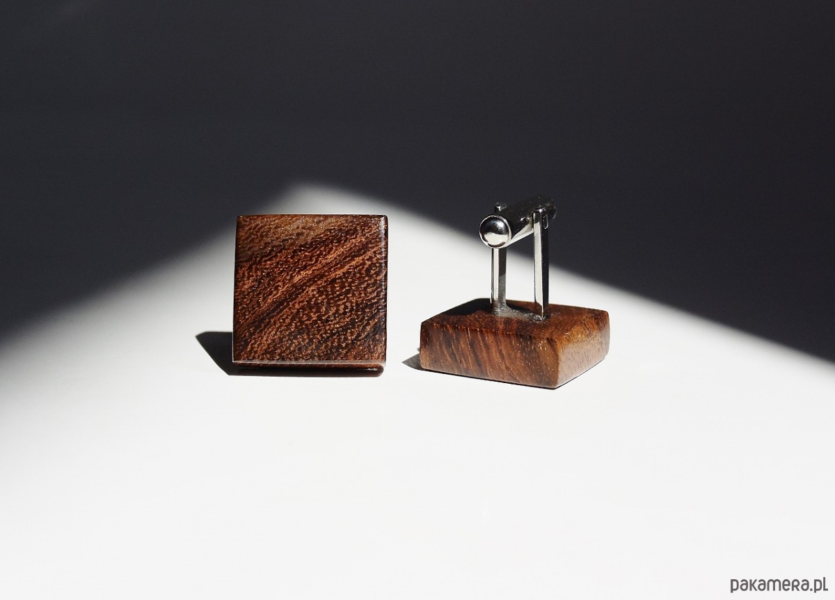 Spinki do mankietów zrobione zostały ręcznie z egzotycznego drewna (z jednego kawałka przepiłowanego na dwie części). Drewno zabezpieczone przez wielokrotne wcieranie wosków i polerowanie (BEZ LAKIERU), dzięki czemu jest gładkie i aksamitne w dotyku. Bazy spinek wykonane ze stali chirurgicznej, więc nie będą ciemniały i to, co bardzo ważne i widoczne jest na jednym ze zdjęć, zostały wklejone w ręcznie wywiercone otwory w drewnie, aby TRWALE połączyć oba elementy (nie są przyklejone na drewno).