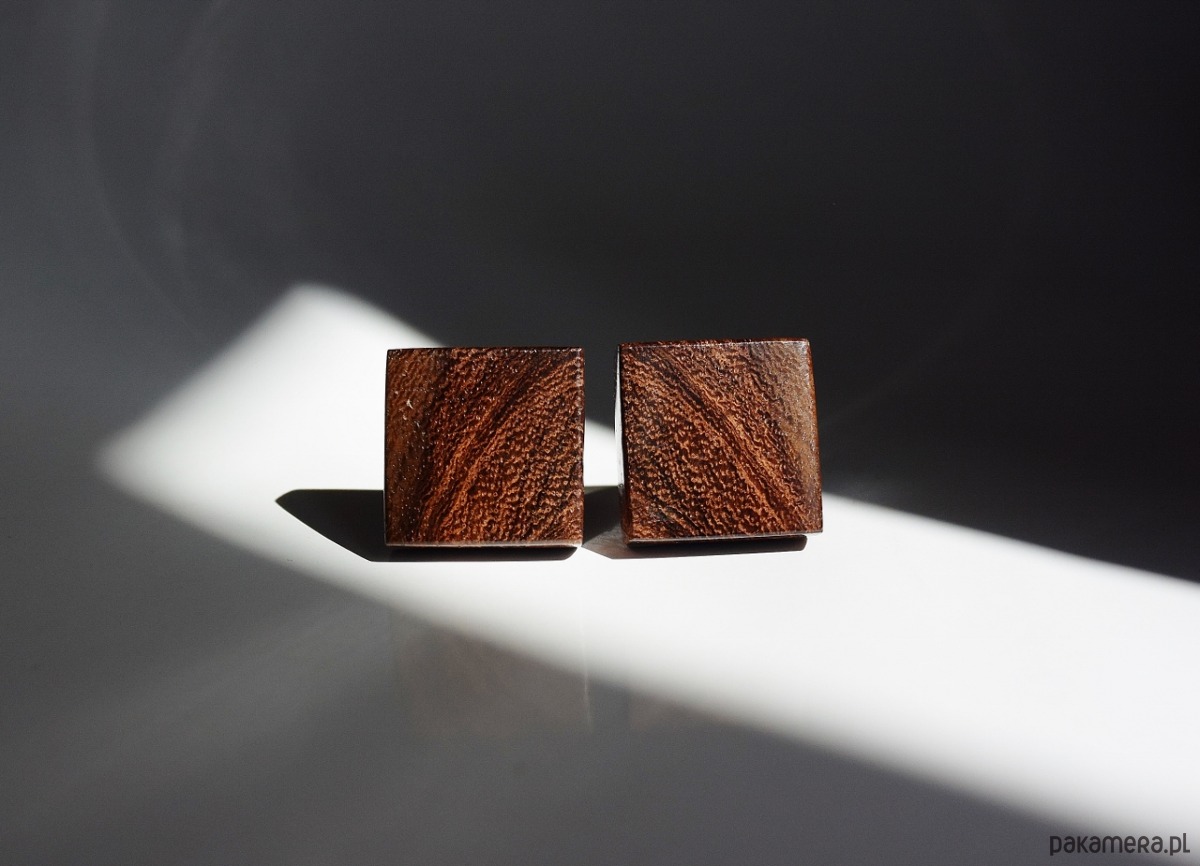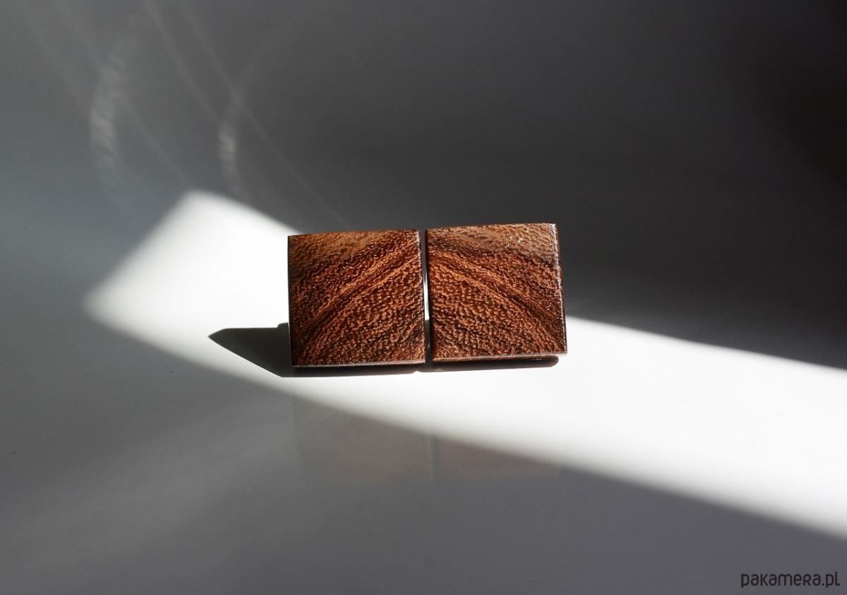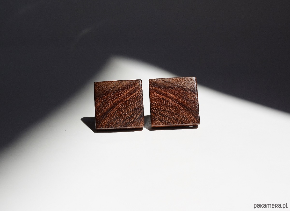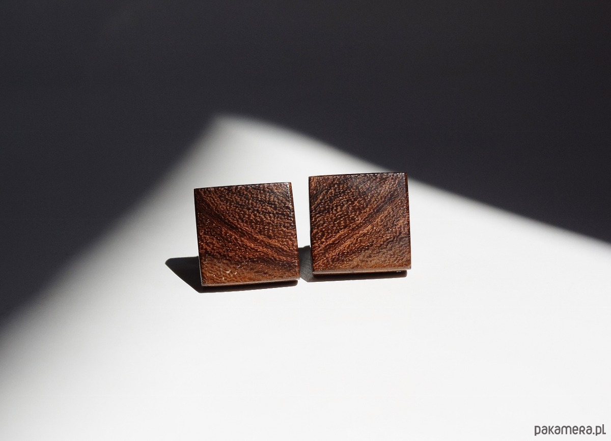Spinki do mankietów zrobione zostały ręcznie z egzotycznego drewna (z jednego kawałka przepiłowanego na dwie części). Drewno zabezpieczone przez wielokrotne wcieranie wosków i polerowanie (BEZ LAKIERU), dzięki czemu jest gładkie i aksamitne w dotyku. Bazy spinek wykonane ze stali chirurgicznej, więc nie będą ciemniały i to, co bardzo ważne i widoczne jest na jednym ze zdjęć, zostały wklejone w ręcznie wywiercone otwory w drewnie, aby TRWALE połączyć oba elementy (nie są przyklejone na drewno).
