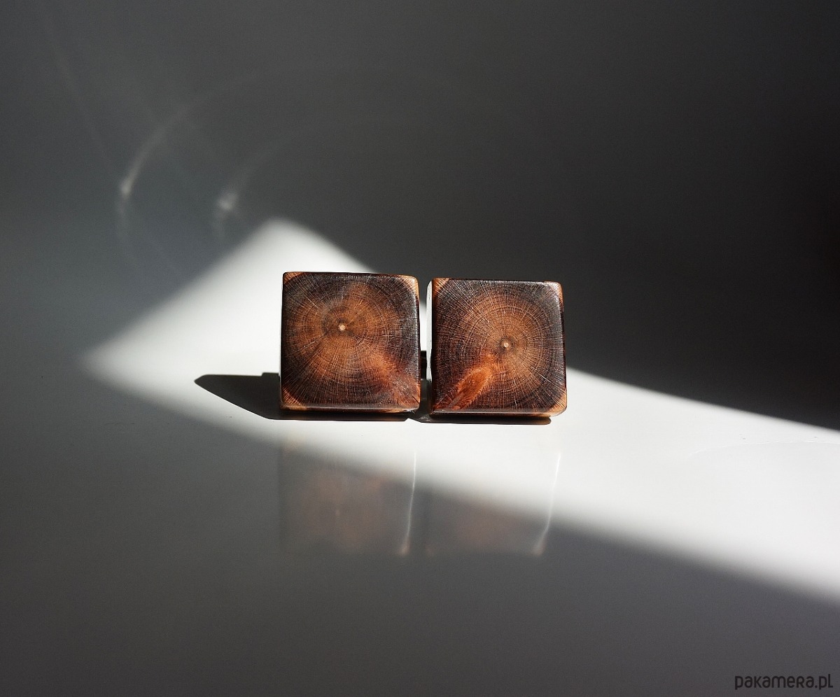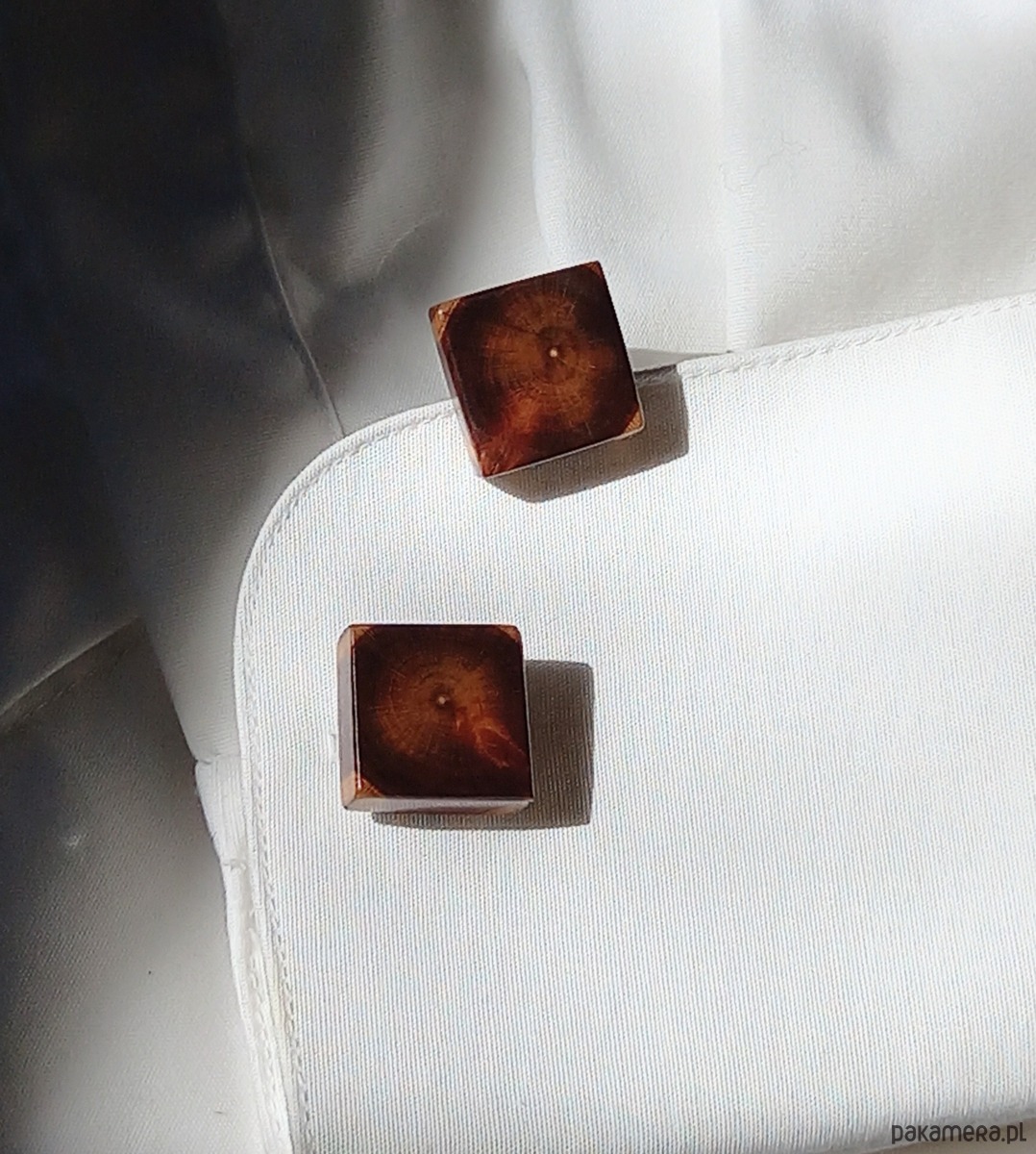 Unikatowe spinki do mankietów zrobione zostały ręcznie z drewna śliwy (z jednego kawałka przepiłowanego na dwie części). Naturalne przebarwienia skojarzyły mi się z dwoma postaciami (na jednej ona, a na drugiej on), ale może Ty zobaczysz zupełnie co innego.Drewno zabezpieczone przez wielokrotne wcieranie wosków i polerowanie (BEZ LAKIERU), dzięki czemu jest gładkie i aksamitne w dotyku. Bazy spinek wykonane ze stali chirurgicznej, więc nie będą ciemniały i to, co bardzo ważne i widoczne jest na jednym ze zdjęć, zostały wklejone w ręcznie wywiercone otwory w drewnie, aby TRWALE połączyć oba elementy (nie są przyklejone na drewno).