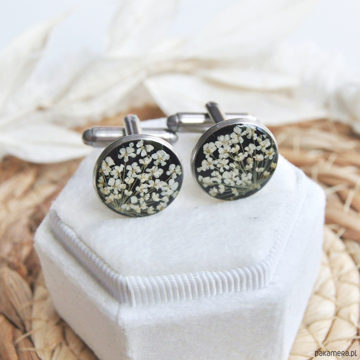 Spinki do mankietów z dziką marchwią na czarnym tle.
