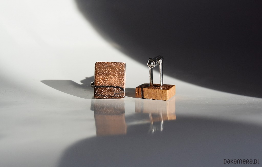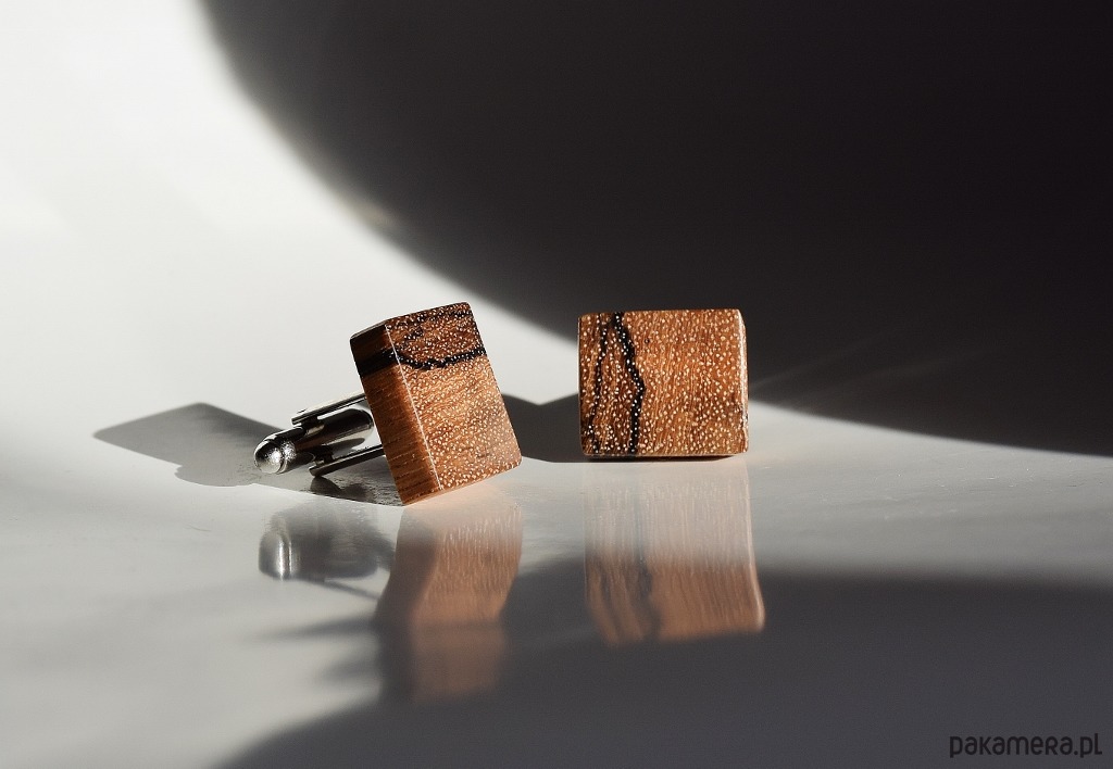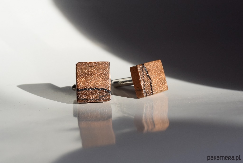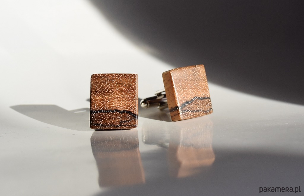 Spinki do mankietów zrobione zostały z egzotycznego drewna zebrano. Zabezpieczone naturalnymi woskami i wypolerowane. Wykonane z jednego kawałka drewna co widoczne jest w rysunku słoi.