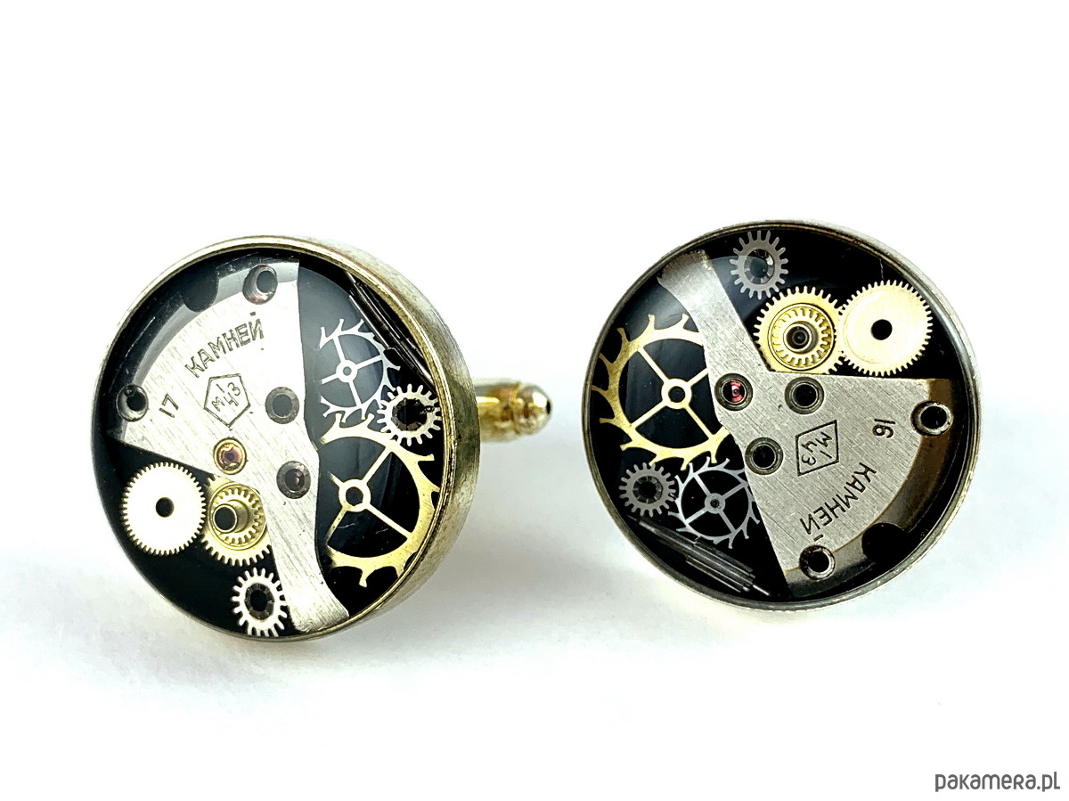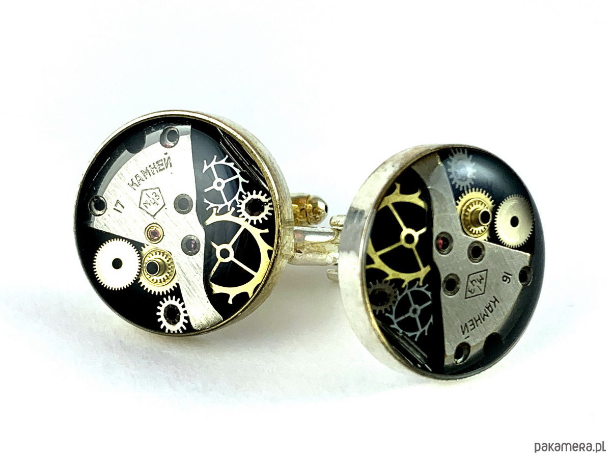 Wyjątkowa ozdoba dla osób, które lubią unikatowe i piękne dodatki na co dzień. Czarne tło spinek, a na nich piękne, mieniące się trybiki - mogą przypominać w każdej momencie jak ważne są chwile, jak cenne są małe elementy/momenty dnia :-)