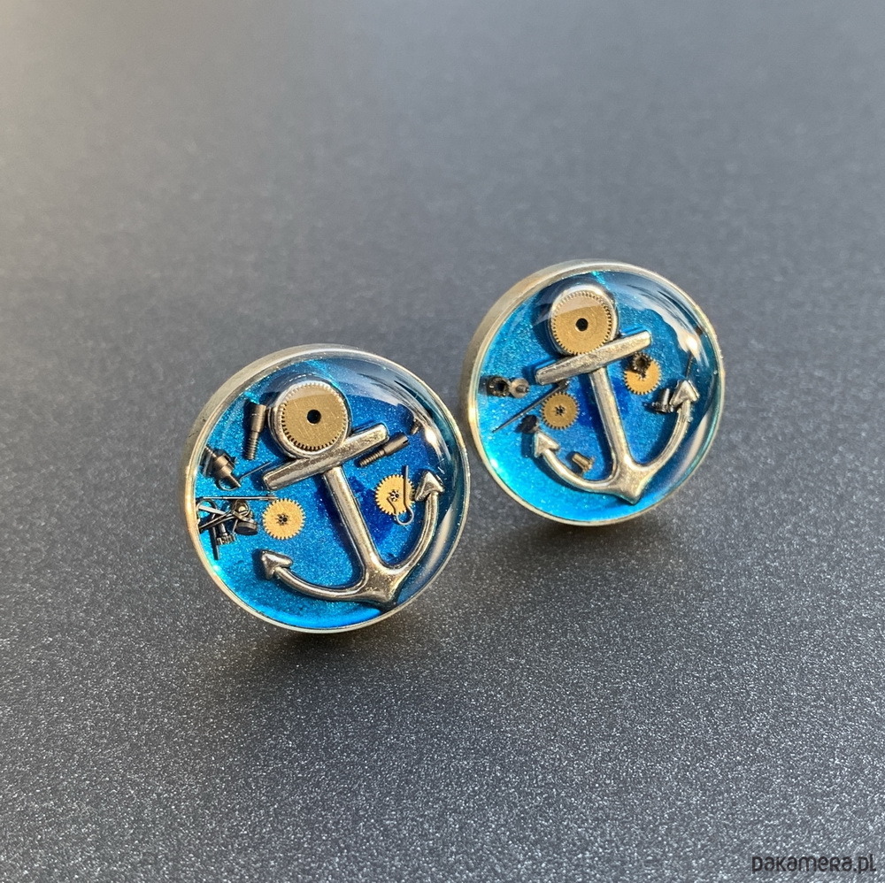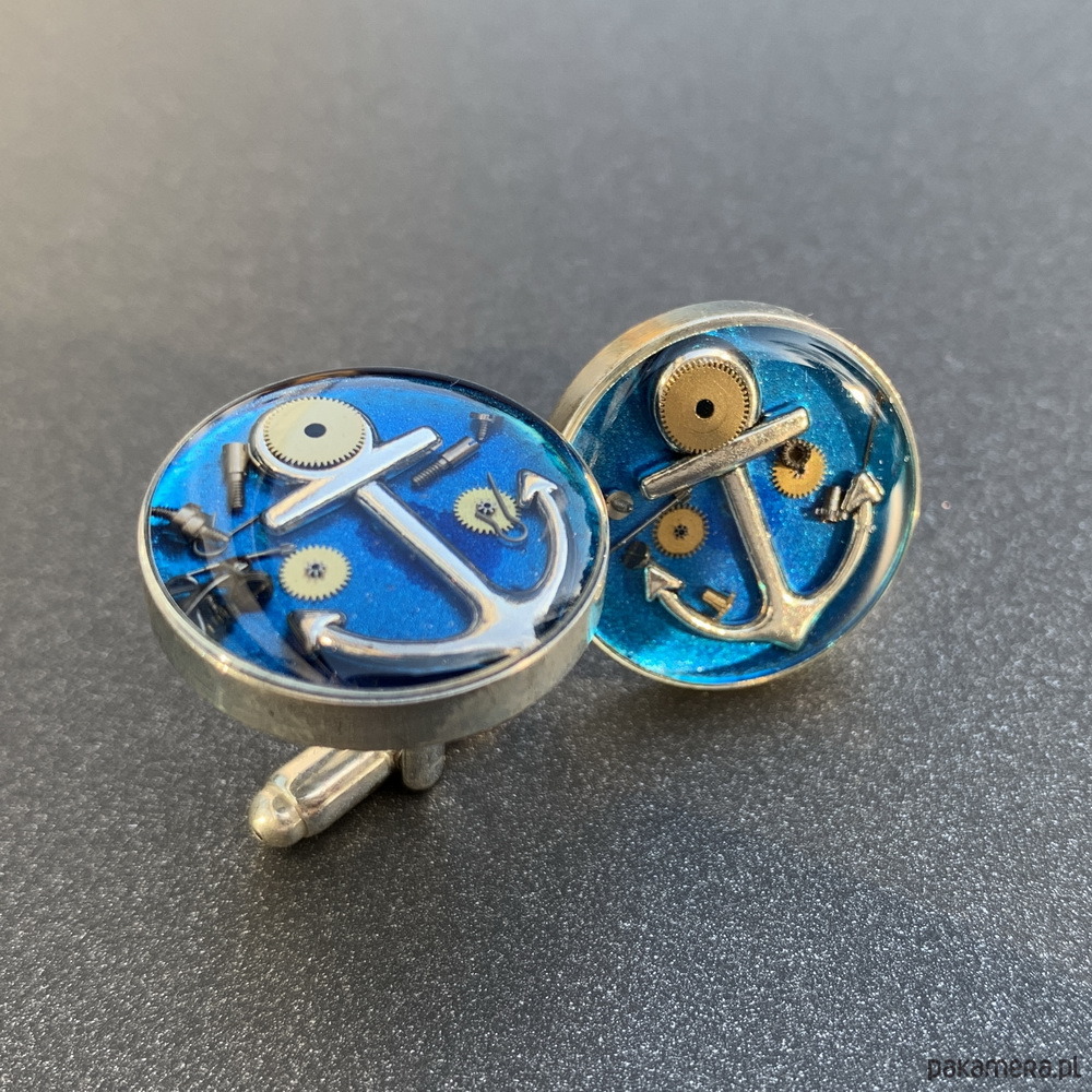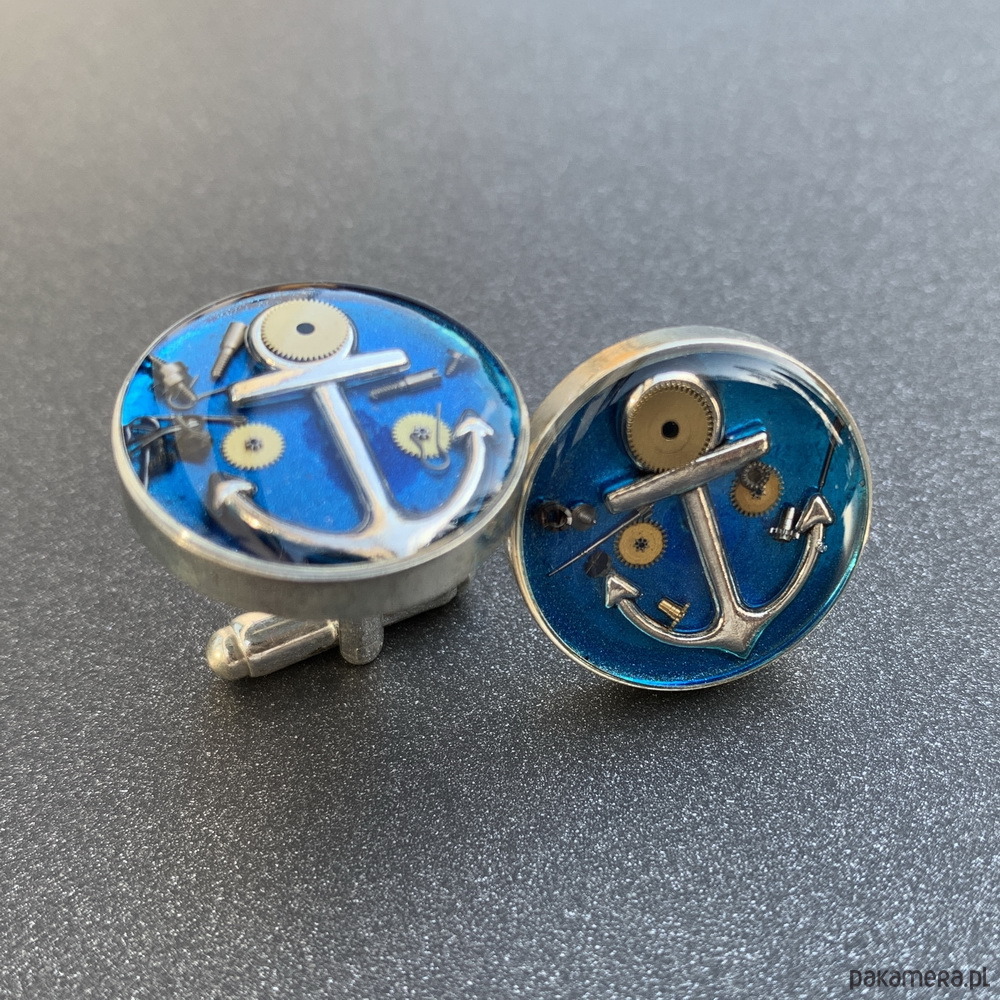 Spineczki z kotwicą i trybikami na niebieskim tle. Bardzo oryginalny drobiazg, który doda uroku każdej koszuli męskiej.