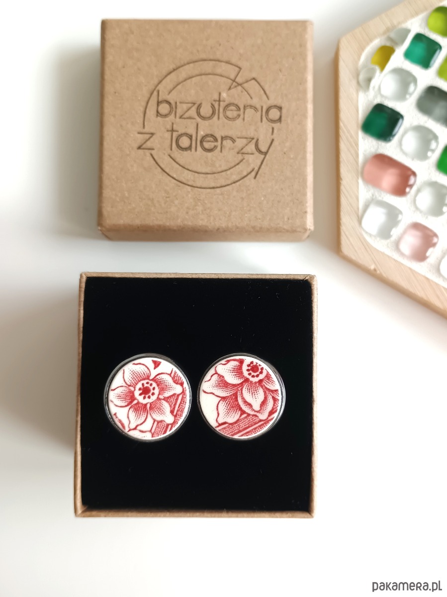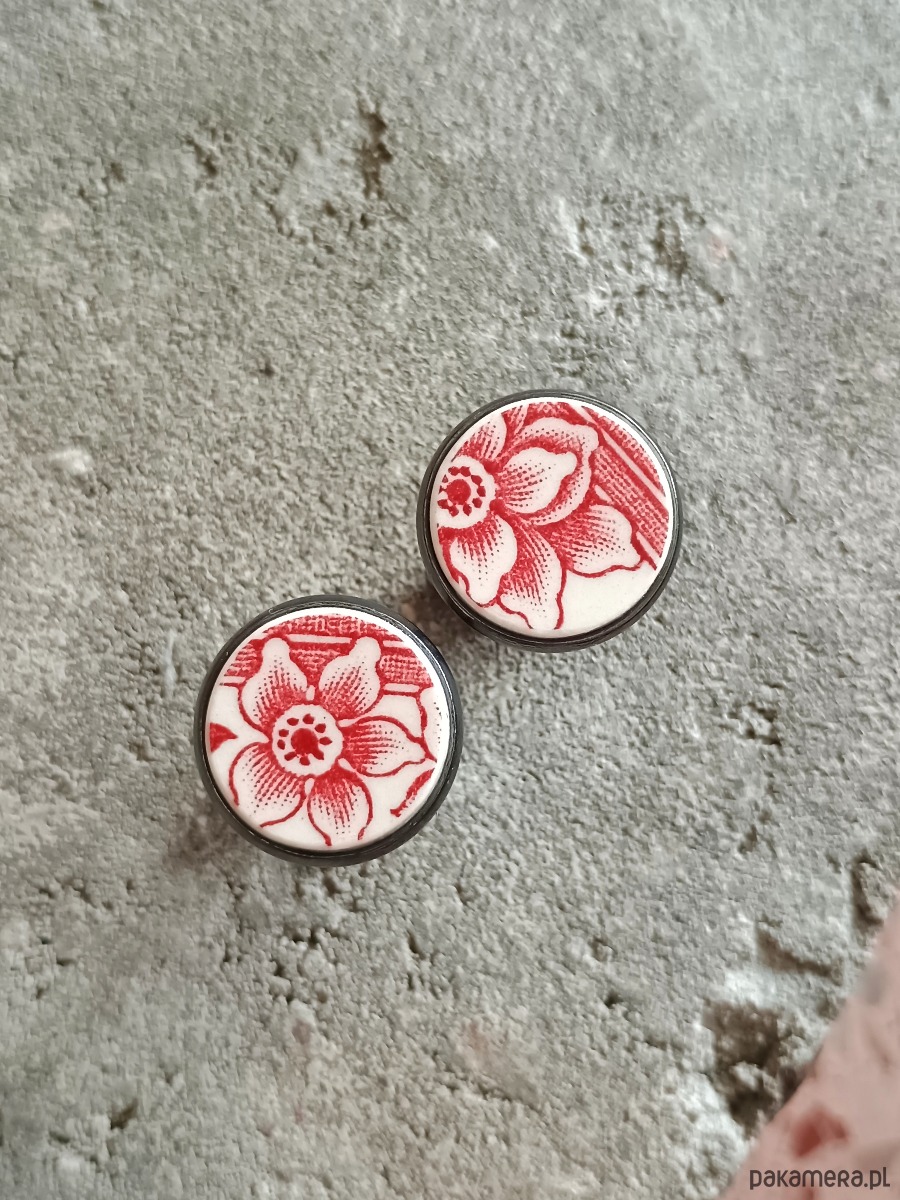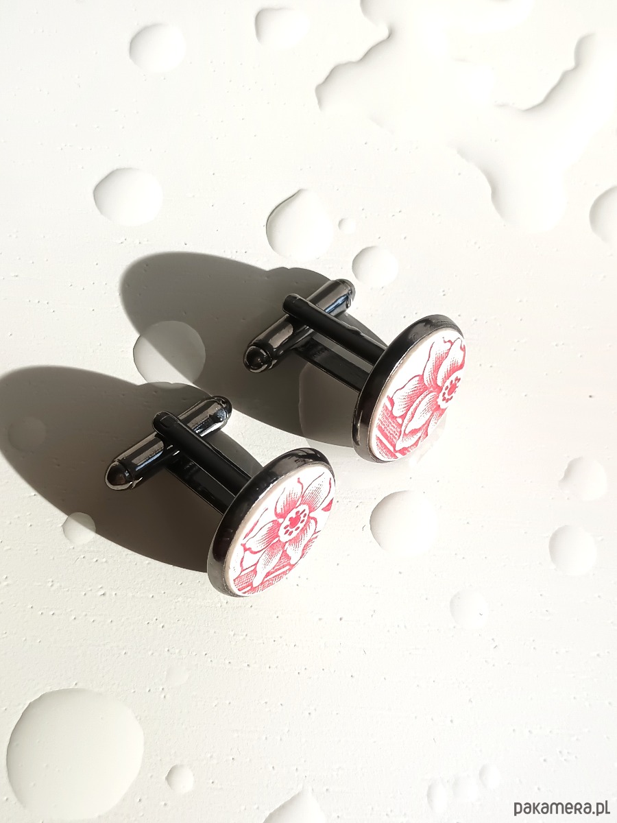 Okrągłe spinki do mankietów, które wykonałam z fragmentów stłuczonego talerza Villeroy & Boch w ciemnoczerwone kwiaty. Kawałki stłuczki oszlifowałam i połączyłam z metalowymi zapięciami w kolorze grafitowym. Ceramikę zeszlifowałam również z grubości - jest cieńsza niż pierwotnie, dzięki czemu spinki nie są masywne. Brzegi pokryłam lakierem, co sprawia, że nie brudzą się i nie chłoną wilgoci. Średnica elementów ceramicznych: 16 mm. Unikat - każdy z moich wyrobów występuje w jednym egzemplarzu. Upcykling - nie reprodukuję wykorzystywanych wzorów, niczego nie domalowuję - wykorzystuję wyłącznie oryginalne naczynia i motywy, które się na nich znajdują. Tym samym, stłuczce z odzysku nadaję nowe życie.