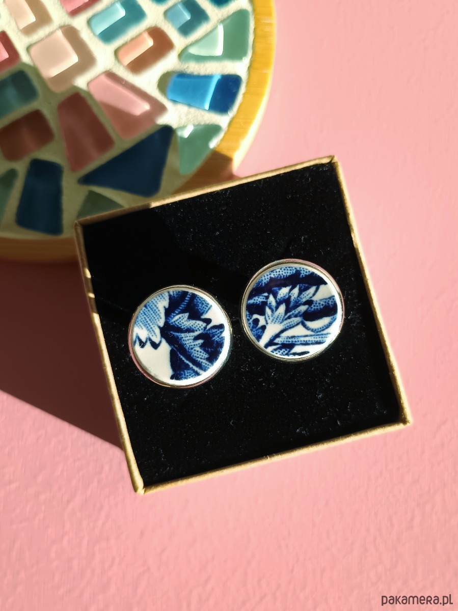 Okrągłe spinki do mankietów, które wykonałam z fragmentów stłuczonego talerza z fajansu angielskiego w kobaltowe wzory. Kawałki stłuczki oszlifowałam i połączyłam z metalowymi zapięciami w kolorze srebrnym. Ceramikę zeszlifowałam również z grubości - jest cieńsza niż pierwotnie, dzięki czemu spinki nie są masywne. Brzegi pokryłam lakierem, co sprawia, że nie brudzą się i nie chłoną wilgoci. Średnica elementów ceramicznych: 16 mm. Unikat - każdy z moich wyrobów występuje w jednym egzemplarzu. Upcykling - nie reprodukuję wykorzystywanych wzorów, niczego nie domalowuję - wykorzystuję wyłącznie oryginalne naczynia i motywy, które się na nich znajdują. Tym samym, stłuczce z odzysku nadaję nowe życie.