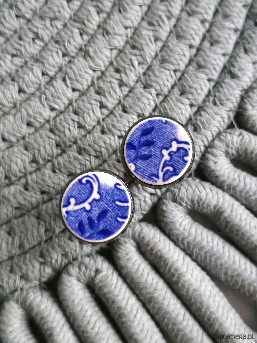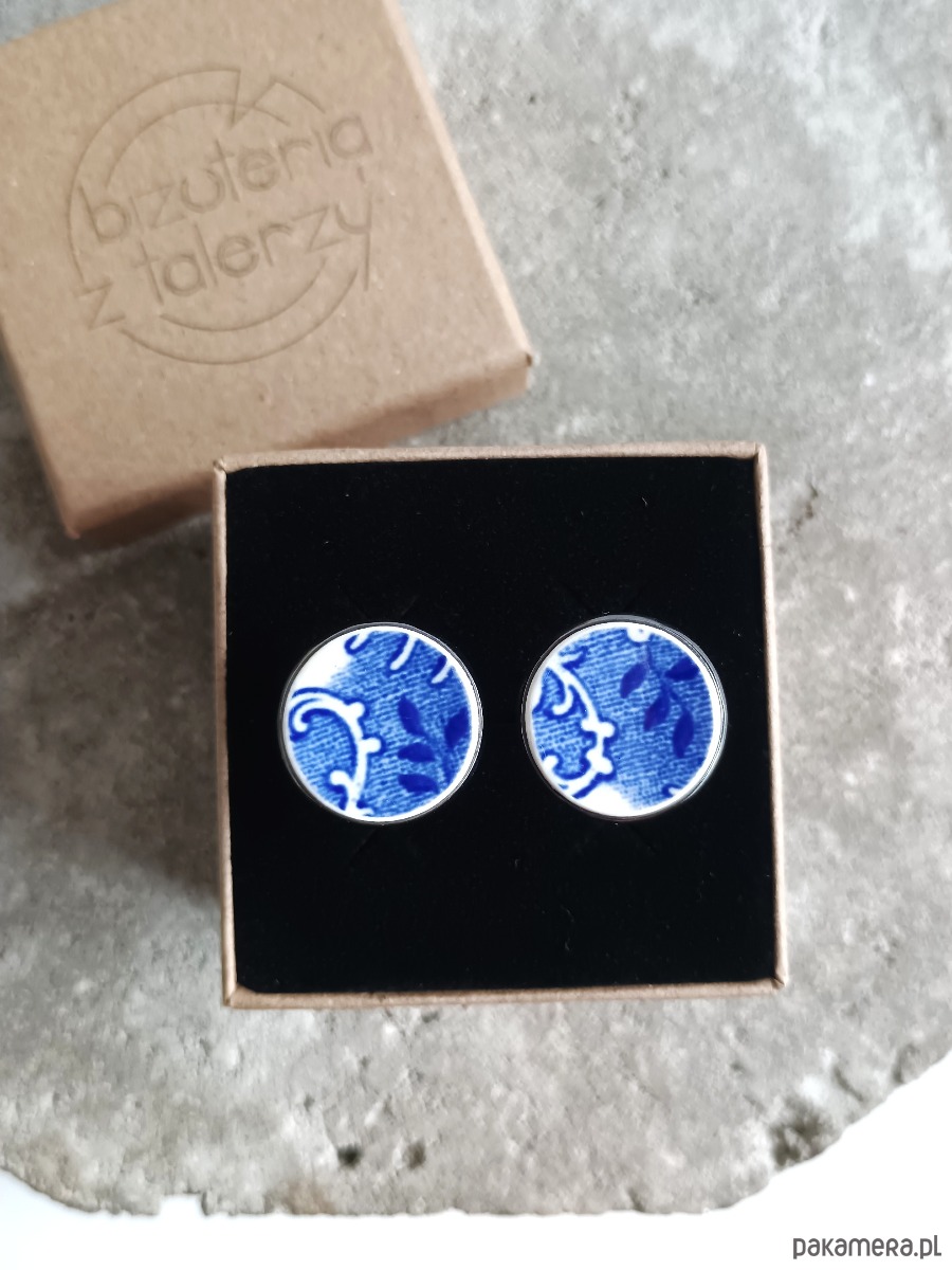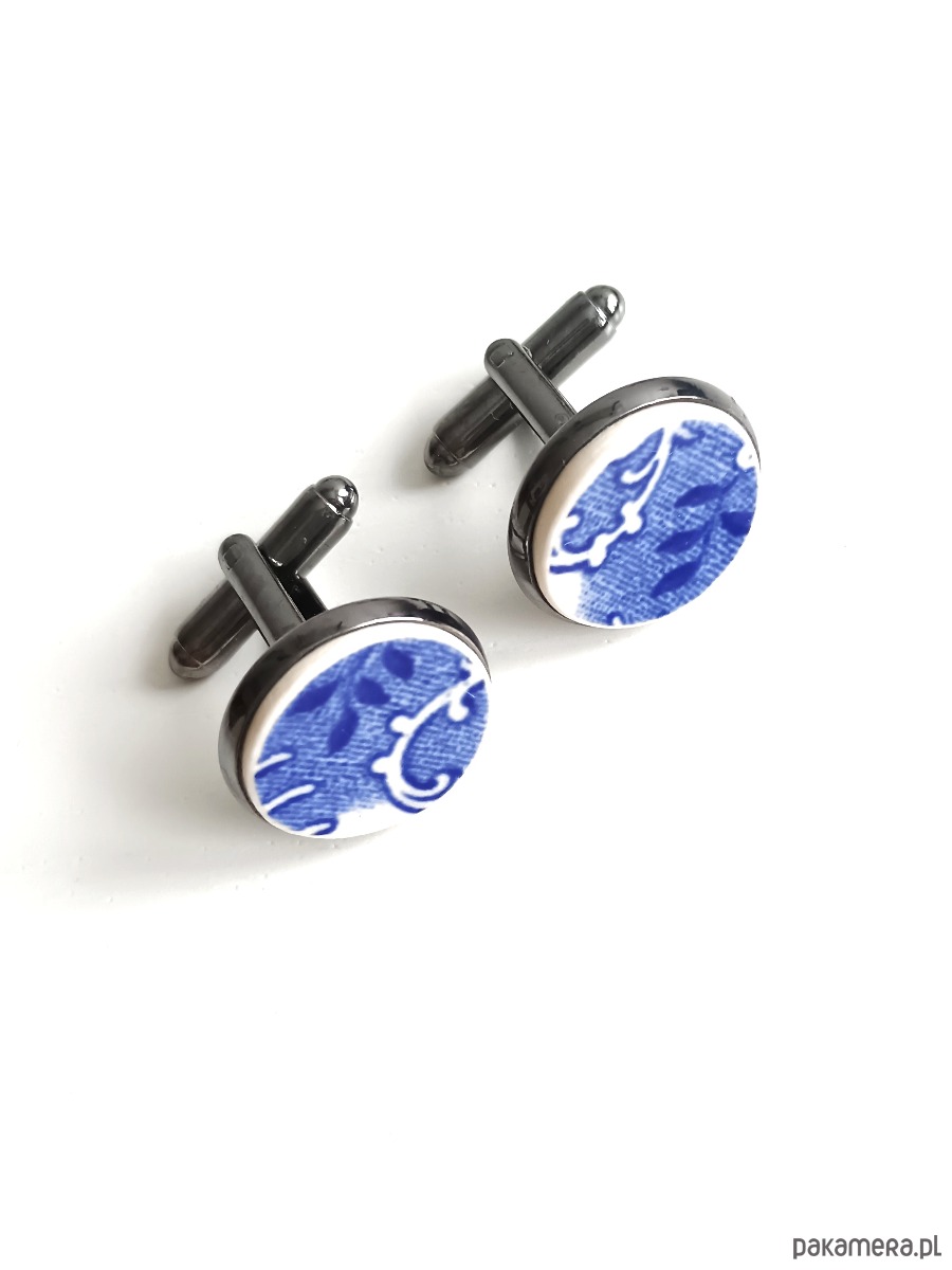 Okrągłe spinki do mankietów, które wykonałam z fragmentów stłuczonego talerza Villeroy & Boch w kobaltowe wzory. Kawałki stłuczki oszlifowałam i połączyłam z metalowymi zapięciami w kolorze grafitowym. Ceramikę zeszlifowałam również z grubości - jest cieńsza niż pierwotnie, dzięki czemu spinki nie są masywne. Brzegi pokryłam lakierem, co sprawia, że nie brudzą się i nie chłoną wilgoci. Średnica elementów ceramicznych: 16 mm. Unikat - każdy z moich wyrobów występuje w jednym egzemplarzu. Upcykling - nie reprodukuję wykorzystywanych wzorów, niczego nie domalowuję - wykorzystuję wyłącznie oryginalne naczynia i motywy, które się na nich znajdują. Tym samym, stłuczce z odzysku nadaję nowe życie.