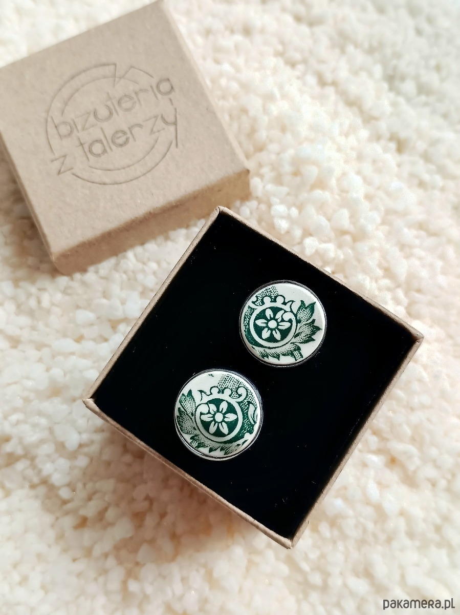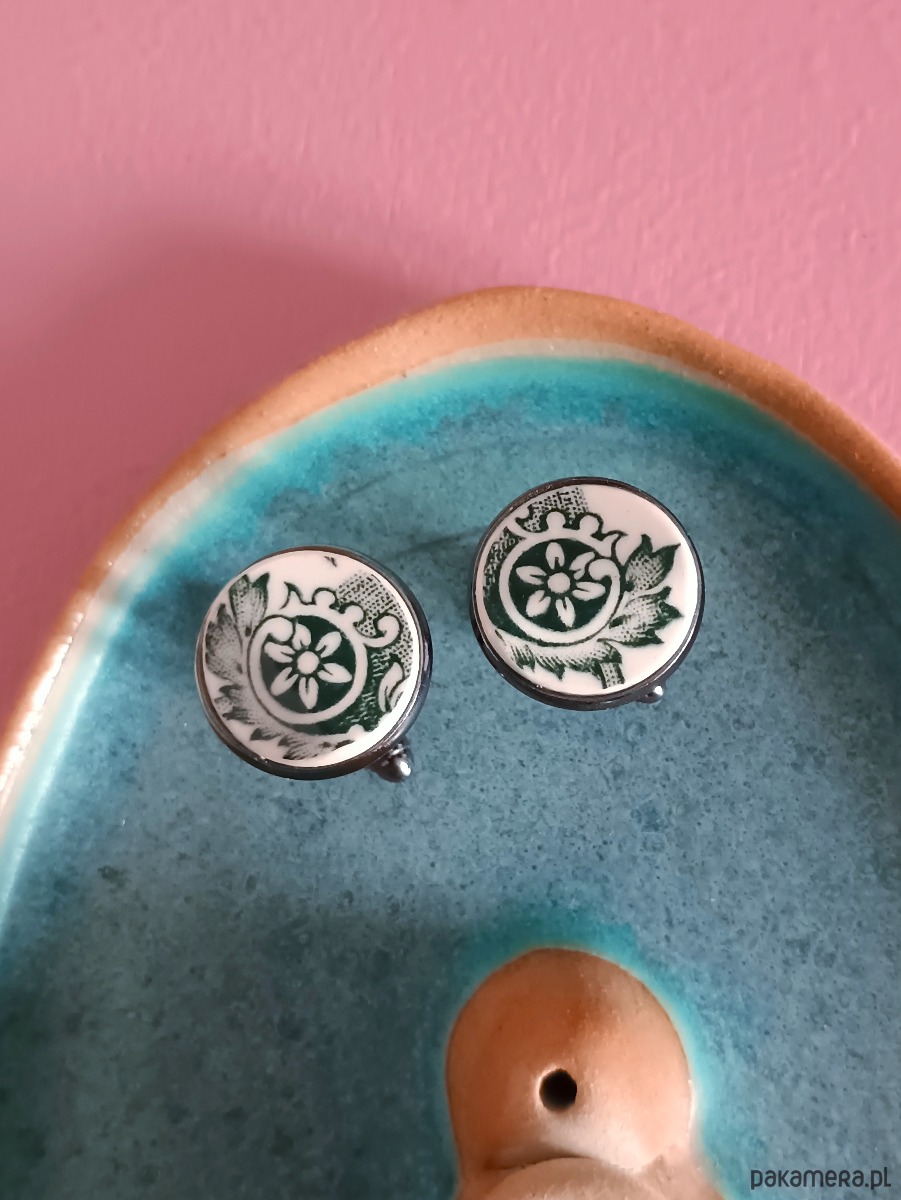 Okrągłe spinki do mankietów, które wykonałam z fragmentów stłuczonego talerza Villeroy & Boch w ciemnozielone wzory. Kawałki stłuczki oszlifowałam i połączyłam z metalowymi zapięciami w kolorze grafitowym. Ceramikę zeszlifowałam również z grubości - jest cieńsza niż pierwotnie, dzięki czemu spinki nie są masywne. Brzegi pokryłam lakierem, co sprawia, że nie brudzą się i nie chłoną wilgoci. Średnica elementów ceramicznych: 16 mm. Unikat - każdy z moich wyrobów występuje w jednym egzemplarzu. Upcykling - nie reprodukuję wykorzystywanych wzorów, niczego nie domalowuję - wykorzystuję wyłącznie oryginalne naczynia i motywy, które się na nich znajdują. Tym samym, stłuczce z odzysku nadaję nowe życie.