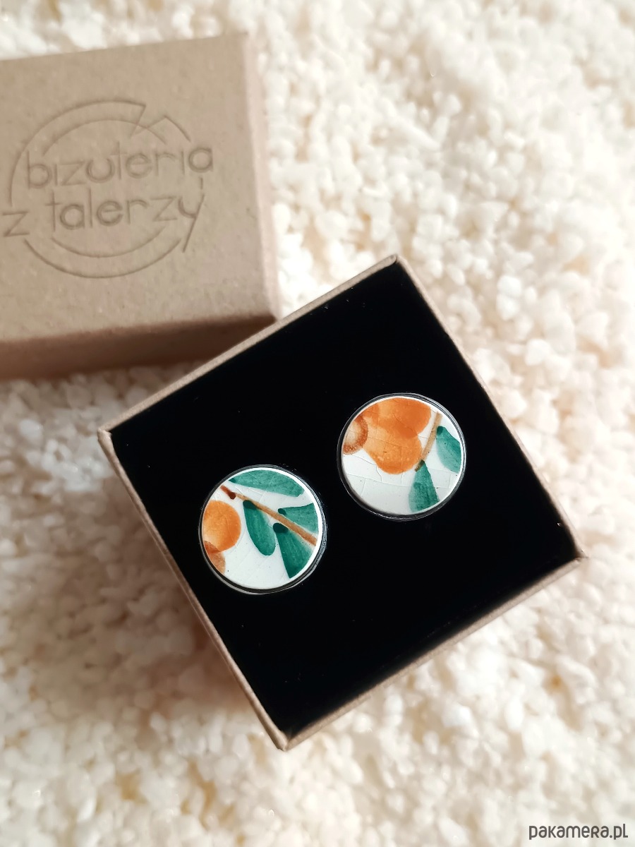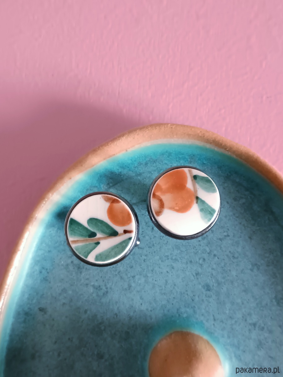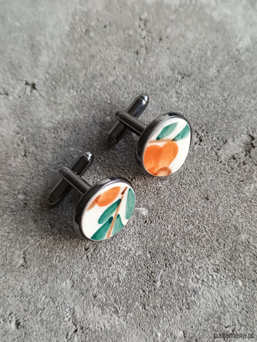 Historia fajansu włocławskiego sięga 1873 roku. Zakładów było kilka, zmieniali się właściciele i lokalizacje. Produkcja najbardziej rozwinęła się po II WŚ, kiedy w miejscowych zakładach powstawał nie tylko fajans, ale również porcelit i porcelana. Zróżnicowane było także wzornictwo - produkowano nie tylko naczynia, ale również elementy wyposażenia wnętrz (lampy, świeczniki, żyrandole). Mimo tej różnorodności, najbardziej rozpoznawalnym wyrobem z Włocławka jest talerz w ręcznie malowane kobaltowe kwiaty (z takich najchętniej korzystam :). I mimo, że najdłużej działająca fabryka zakończyła działalność w 1991 roku, dzięki lokalnym inicjatywom produkcja fajansu została wznowiona i trwa do dziś! Oto okrągłe spinki do mankietów, które wykonałam z fragmentów fajansu włocławskiego ręcznie malowanego w kolorowe wzory. Kawałki stłuczki oszlifowałam i połączyłam z metalowymi zapięciami w kolorze grafitowym. Ceramikę zeszlifowałam również z grubości - jest cieńsza niż pierwotnie, dzięki czemu spinki nie są masywne. Brzegi pokryłam lakierem, co sprawia, że nie brudzą się i nie chłoną wilgoci. Średnica elementów ceramicznych: 16 mm. Spinki zapakowane są w eleganckie eko pudełko. Unikat - każdy z moich wyrobów występuje w jednym egzemplarzu. Upcykling - nie reprodukuję wykorzystywanych wzorów, niczego nie domalowuję - wykorzystuję wyłącznie oryginalne naczynia i motywy, które się na nich znajdują. Tym samym, stłuczce z odzysku nadaję nowe życie.