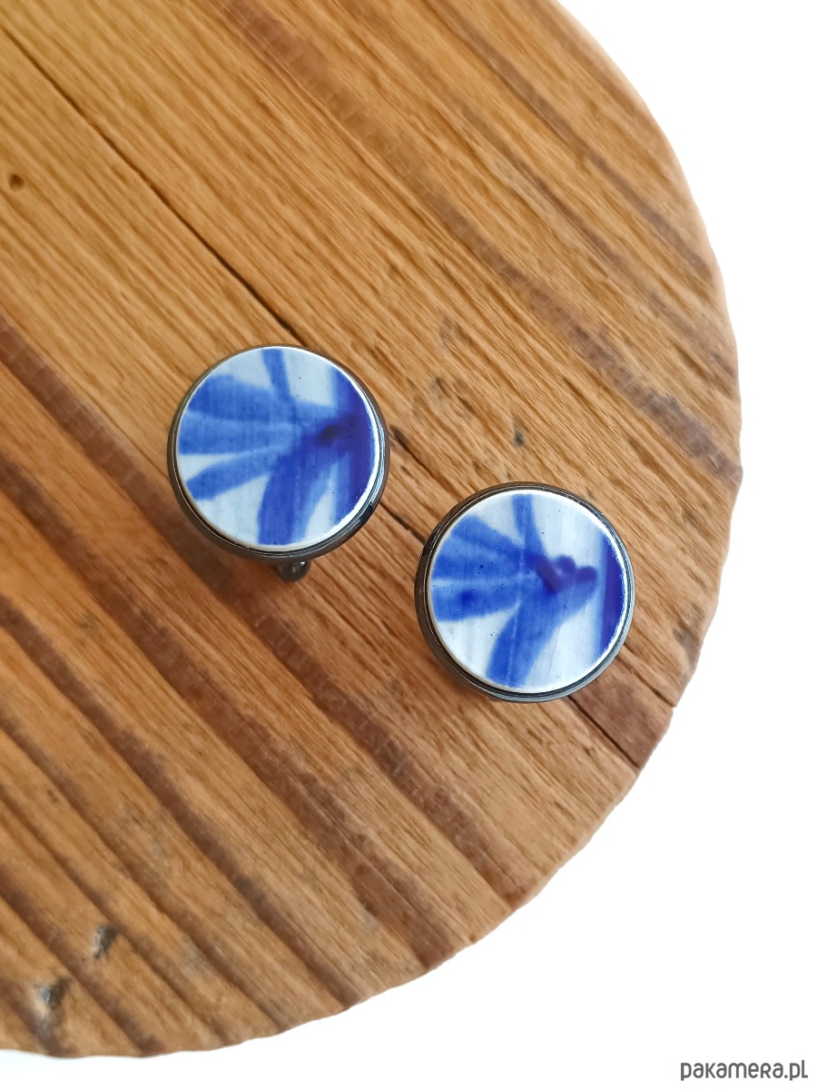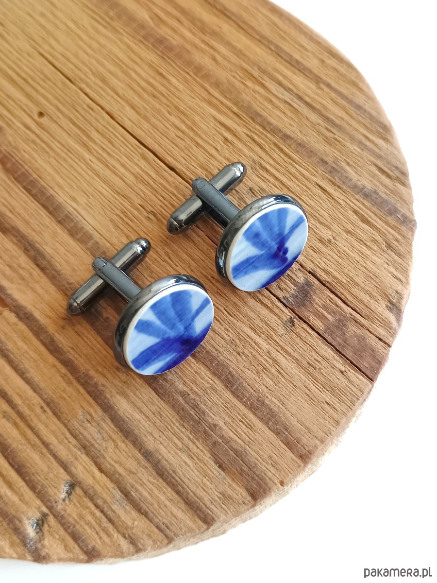 Historia fajansu włocławskiego sięga 1873 roku. Zakładów było kilka, zmieniali się właściciele i lokalizacje. Produkcja najbardziej rozwinęła się po II WŚ, kiedy w miejscowych zakładach powstawał nie tylko fajans, ale również porcelit i porcelana. Zróżnicowane było także wzornictwo - produkowano nie tylko naczynia, ale również elementy wyposażenia wnętrz (lampy, świeczniki, żyrandole). Mimo tej różnorodności, najbardziej rozpoznawalnym wyrobem z Włocławka jest talerz w ręcznie malowane kobaltowe kwiaty (z takich najchętniej korzystam :). I mimo, że najdłużej działająca fabryka zakończyła działalność w 1991 roku, dzięki lokalnym inicjatywom produkcja fajansu została wznowiona i trwa do dziś! Oto okrągłe spinki do mankietów, które wykonałam z fragmentów fajansu włocławskiego ręcznie malowanego w kobaltowe wzory. Kawałki stłuczki oszlifowałam i połączyłam z metalowymi zapięciami w kolorze grafitowym. Ceramikę zeszlifowałam również z grubości - jest cieńsza niż pierwotnie, dzięki czemu spinki nie są masywne. Brzegi pokryłam lakierem, co sprawia, że nie brudzą się i nie chłoną wilgoci. Średnica elementów ceramicznych: 16 mm. Spinki zapakowane są w eleganckie eko pudełko. Unikat - każdy z moich wyrobów występuje w jednym egzemplarzu. Upcykling - nie reprodukuję wykorzystywanych wzorów, niczego nie domalowuję - wykorzystuję wyłącznie oryginalne naczynia i motywy, które się na nich znajdują. Tym samym, stłuczce z odzysku nadaję nowe życie.