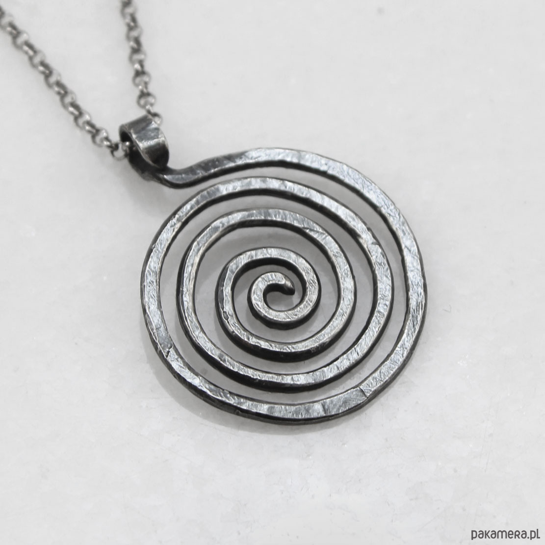 Wisior został wykonany ręcznie ze srebra wysokiej próby, posiada nieregularną fakturę i jest lekko patynowany w procesie oksydacji (bez użycia sztucznych barwników). Całkowita długość wisiorka to ok 3 cm. W komplecie jest bawełniany sznurek do zawieszenia.