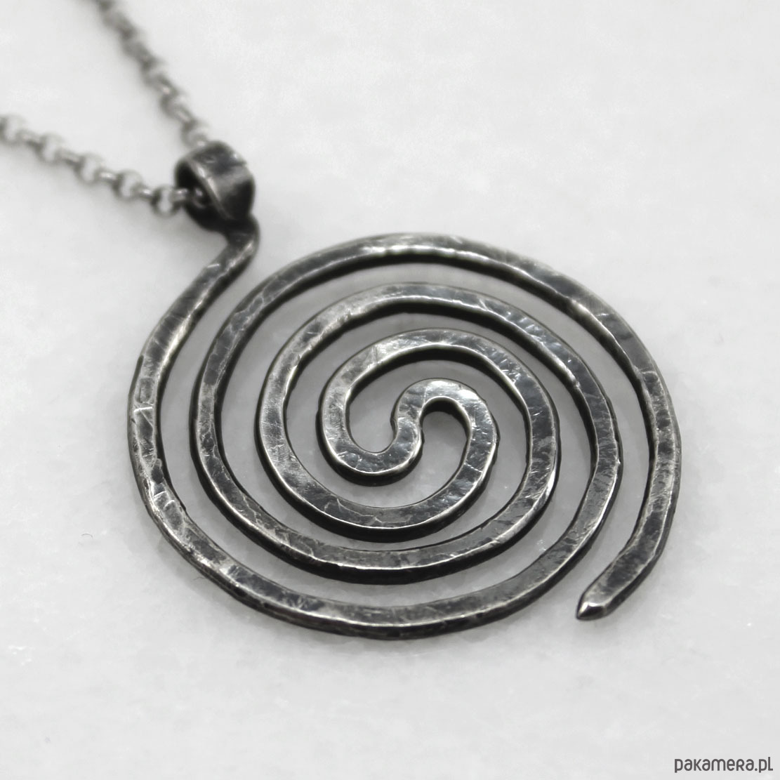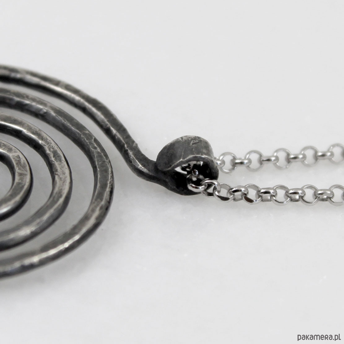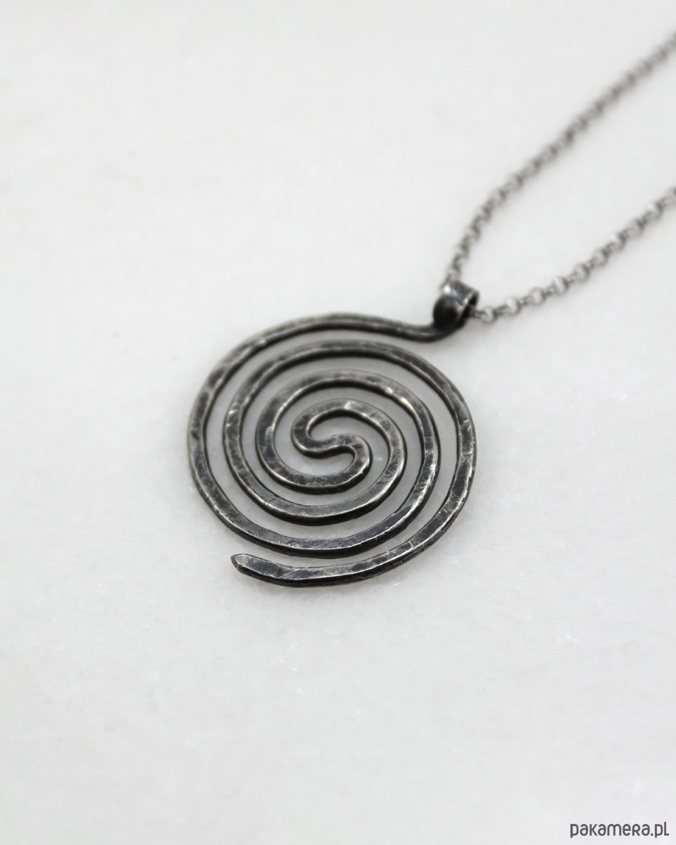 Wisior został wykonany ręcznie ze srebra wysokiej próby, posiada nieregularną fakturę i jest lekko patynowany w procesie oksydacji (bez użycia sztucznych barwników). Całkowita długość wisiorka to ok 3 cm. W komplecie jest bawełniany sznurek do zawieszenia.