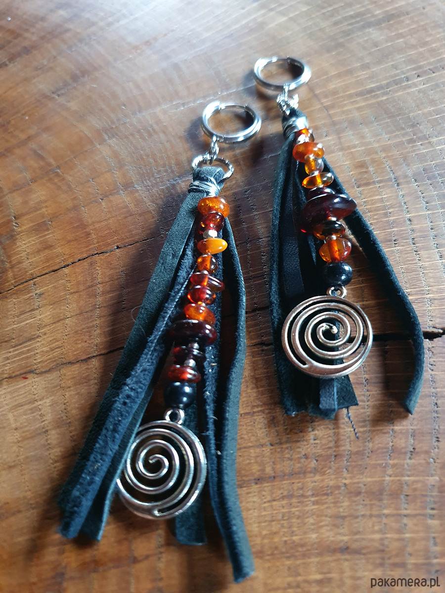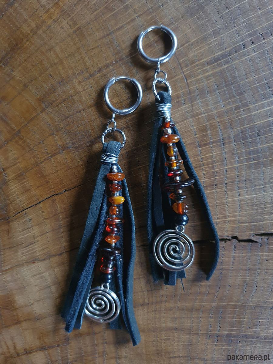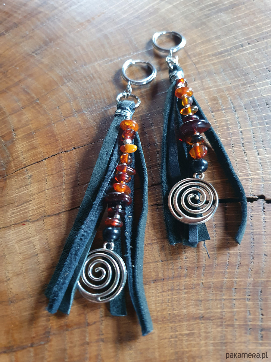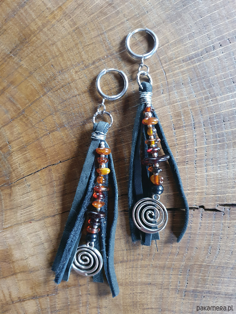 Etniczne kolczyki wykonane z czarnego rzemienia, koralików metalowych i bursztynowych.