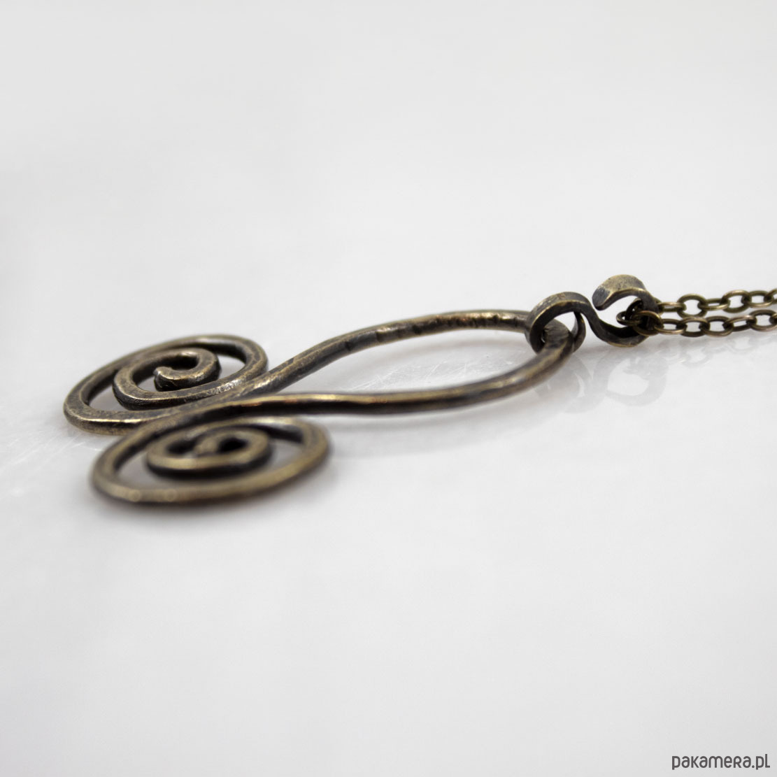 Wisior został wykonany ręcznie z mosiądzu, posiada nieregularną fakturę i jest lekko patynowany w procesie oksydacji (bez użycia sztucznych barwników). Całkowita długość wisiorka to ok 3 cm. W komplecie łańcuszek do zawieszenia.