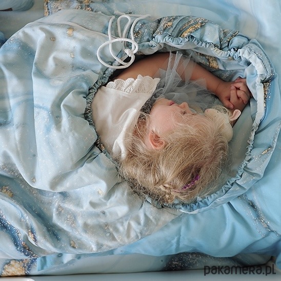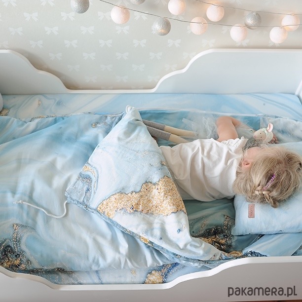 LUXURY AGATE. Wzór agatu z różnymi odcieniami błękitu oraz złotymi akcentami. Śpiworek rośnie razem z dzieckiem - jest odpowiedni dla dzieci od 2-10 lat.