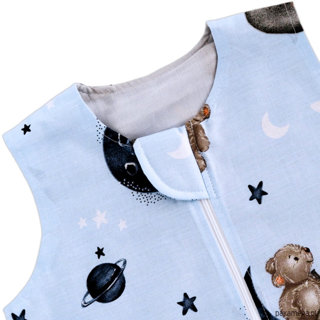 Śpiworek BabyU gwarantuje zdrowie, otulenie i zapobiega odkrywaniu się aktywnego i ruchliwego maluszka. Konstrukcja naszego śpiworka zapewnia pełną swobodę ruchu rączek, gdy maluszek obraca się, czy śpi na brzuszku. Rozszerzający się ku dołowi krój i nogawki wykonane z delikatnej, elastycznej bawełny, wspierają rozwój bioder, idealnie sprawdzą się podczas pierwszych samodzielnych podróży Twojego maluszka oraz zapewniają pełen komfort podczas odpoczynku. Dodatkowo nogawki możesz szybko zamienić w ciepłe skarpetki dla zapewnienia idealnego komfortu termicznego małym stopkom. Zaprojektowaliśmy też obustronnie rozsuwany zamek ułatwiający zmianę pieluszki bez przerywania snu dzieciaczka.