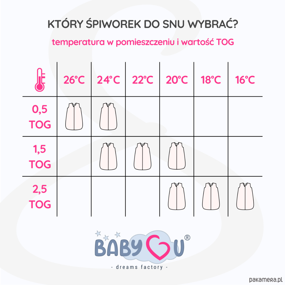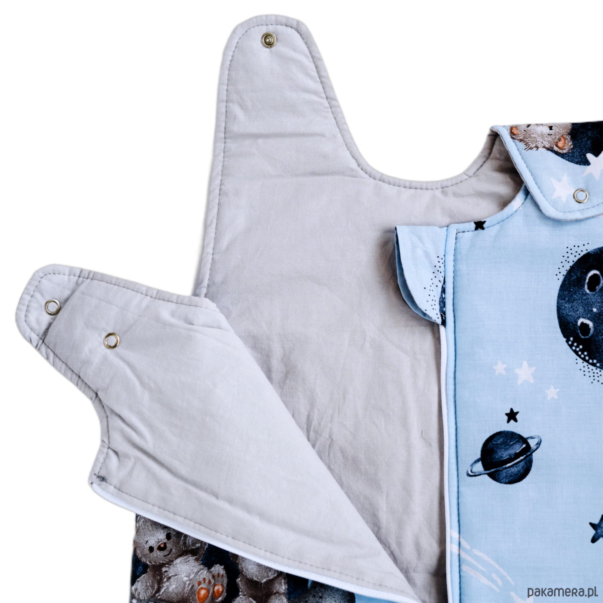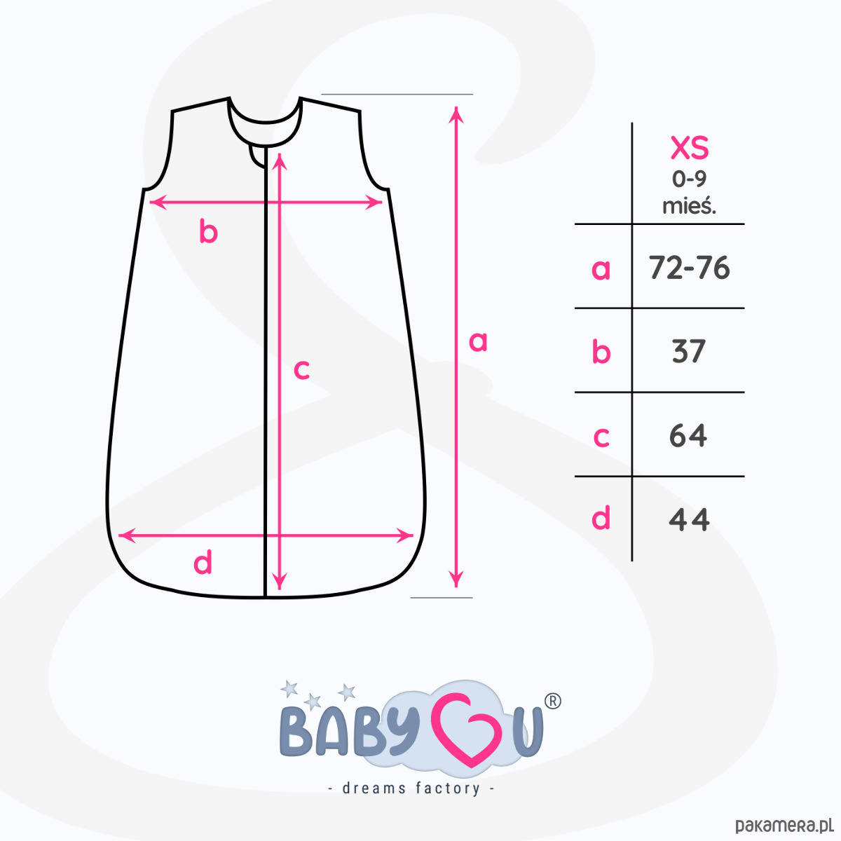 Dwustronny śpiworek BabyU gwarantuje zdrowie, ciepło, otulenie i zapobiega odkrywaniu się aktywnego i ruchliwego maluszka. Konstrukcja naszego śpiworka zapewnia pełne bezpieczeństwo i komfort - uniemożliwia zsunięcie się główki do środka śpiworka czy jego naciągnięcie na buzię maluszka. Rozszerzający się ku dołowi krój pozwala swobodnie poruszać nóżkami, zapewniając pełen komfort podczas odpoczynku. Zaprojektowaliśmy też obustronnie rozsuwany zamek ułatwiający zmianę pieluszki, nie przerywając snu maluszka oraz podwójne napy na ramionkach do idealnego dopasowania śpiworka.