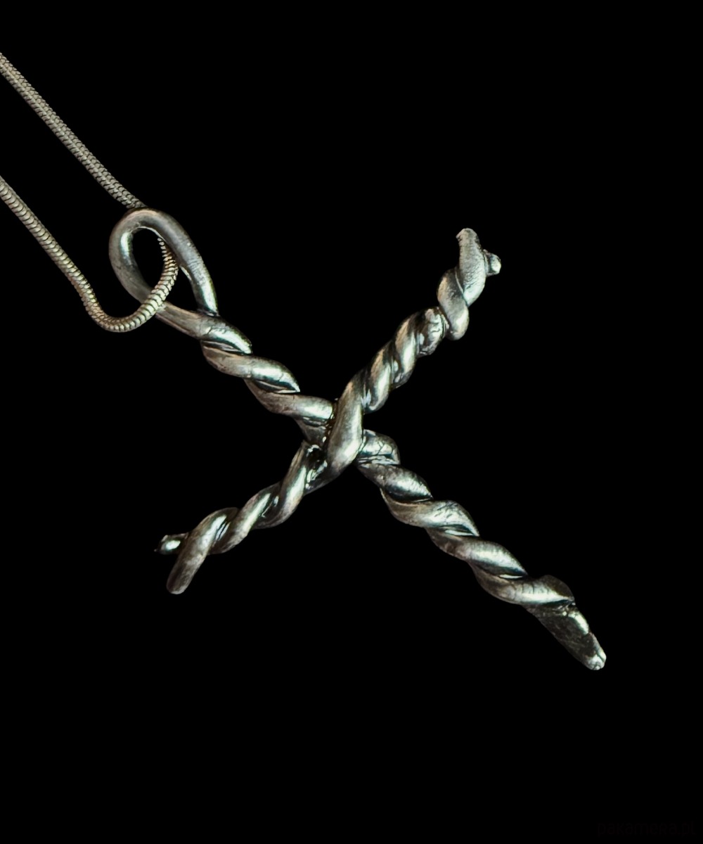 Hand-carved and oxidized, the pendant takes the form of a cross, formed from two intertwined elements. It symbolizes the unbreakable ties that bind souls together, reminding us of the strength of human bonds and shared experiences.