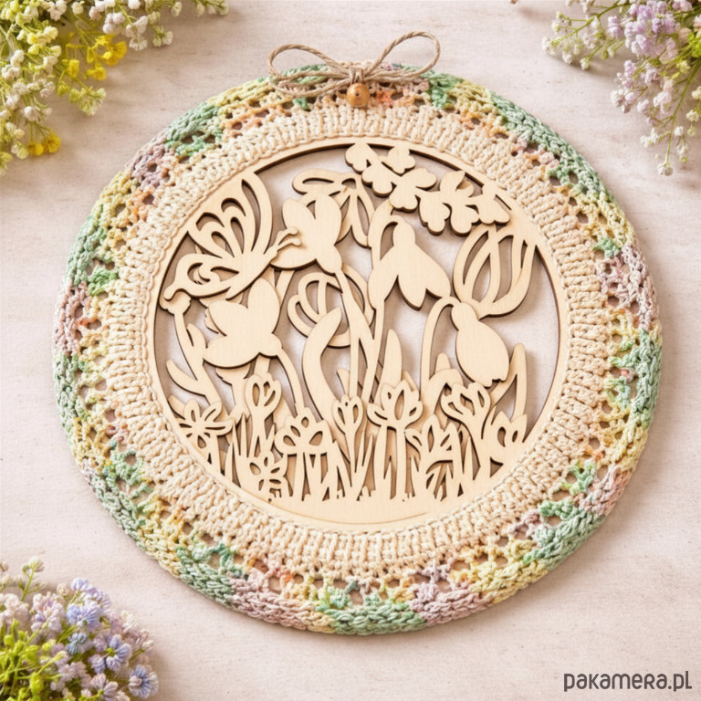 Praktyczna i estetyczna baza do szydełkowania wykonana ze sklejki w formie okręgu o średnicy 15 cm. Model trzywarstwowy z ażurowym wzorem doskonale sprawdzi się jako solidna podstawa do różnego rodzaju projektów handmade.
