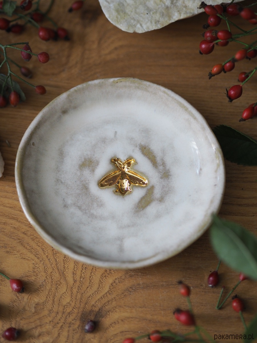 uroczych nóżkach. Beżowe szkliwo z odrobiną różu dodaje uroku i świetnie kontrastuje z motywem pszczoły. Zdobione prawdziwym złotem.
