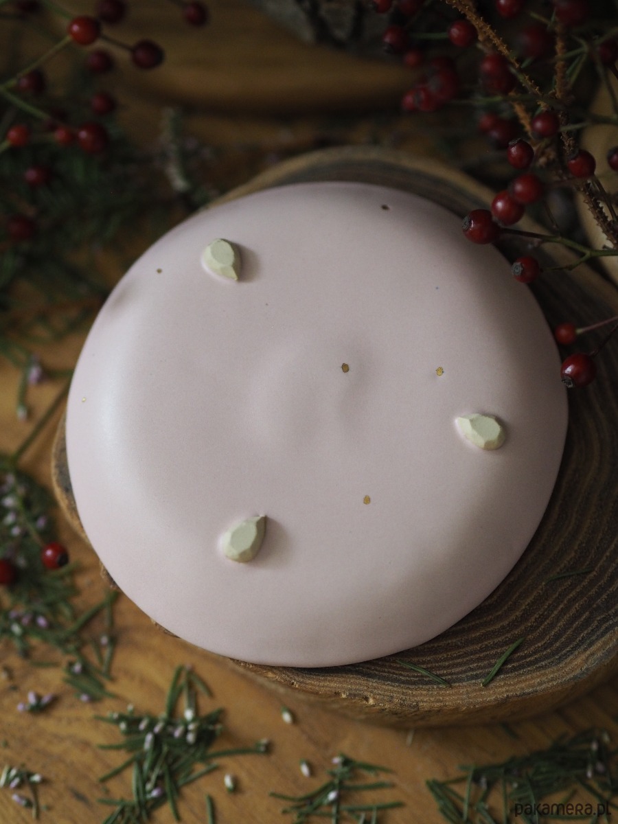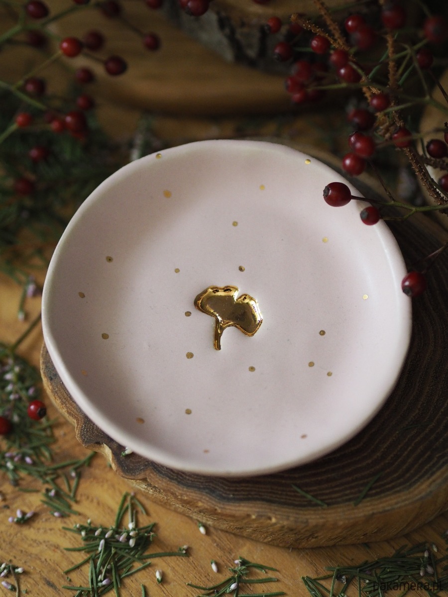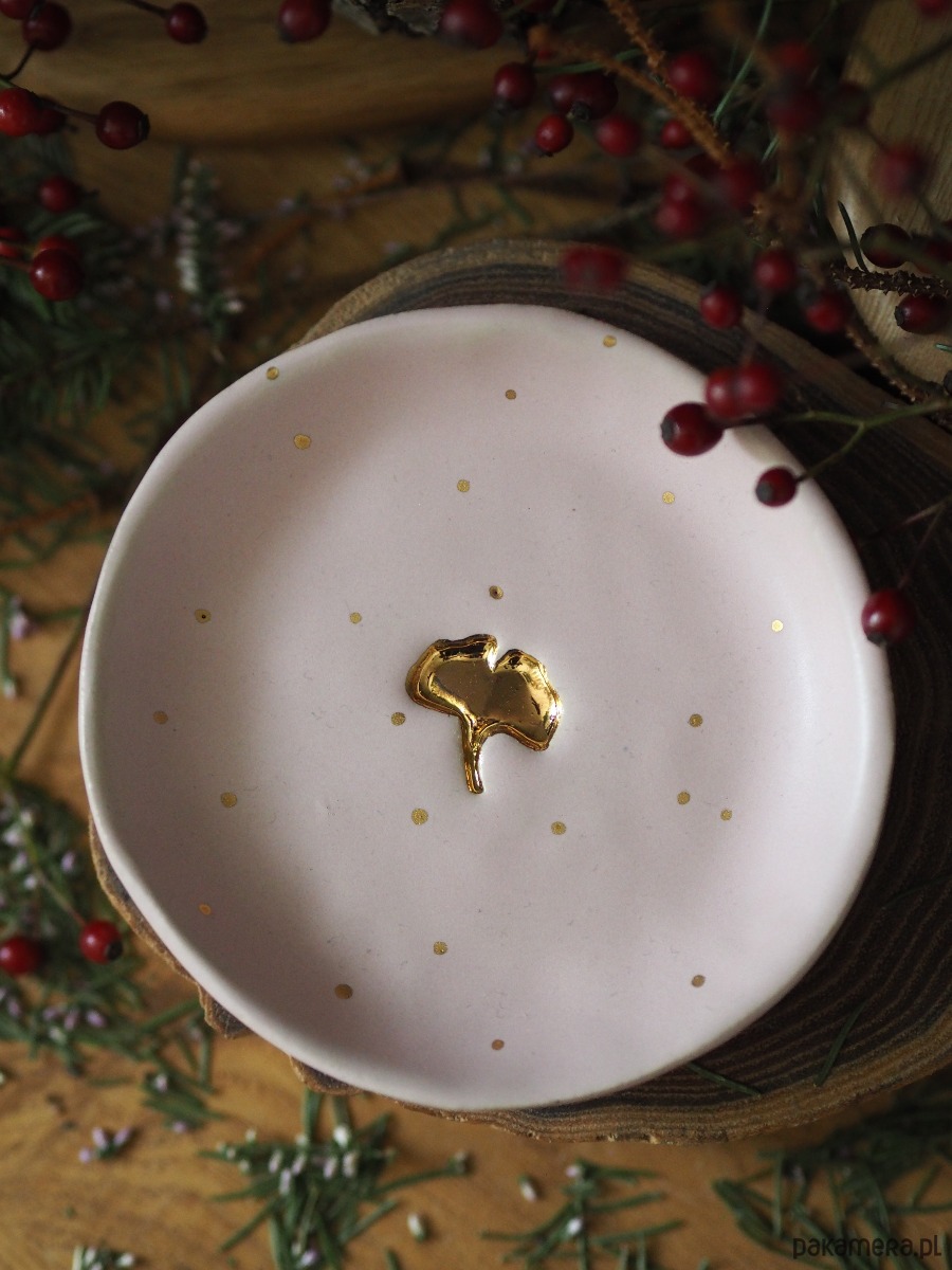 uroczych nóżkach. Różowe, matowe szkliwo dodaje uroku i świetnie kontrastuje z motywem listka miłorzębu. Zdobione prawdziwym złotem.