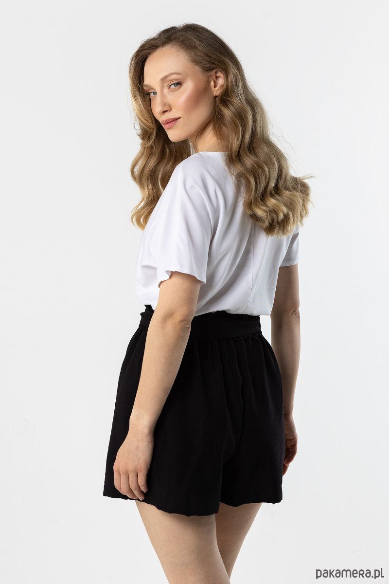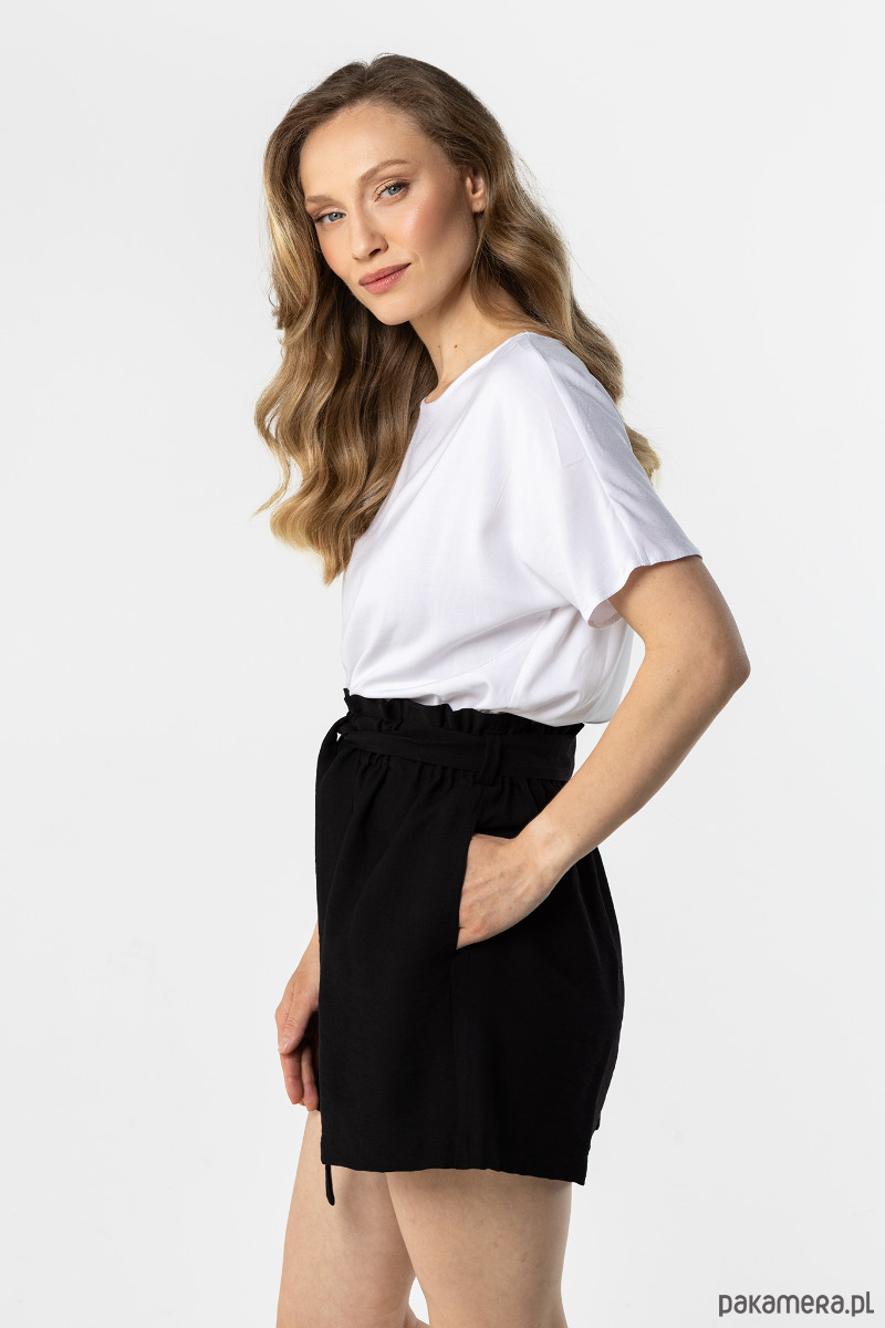Czarne spodenki o lekkim, swobodnym kroju z elastyczną gumką w pasie i wiązaniem, które podkreśla talię. Zwiewny materiał i luźne nogawki zapewniają komfort noszenia, a minimalistyczny fason sprawia, że model świetnie sprawdzi się w codziennych i letnich stylizacjach.