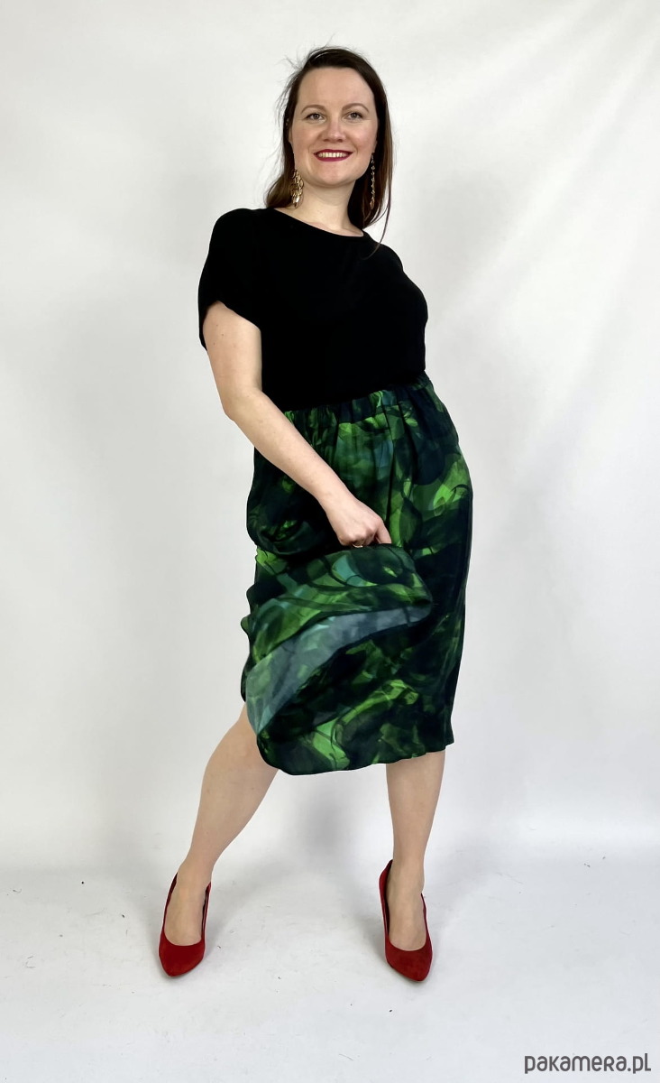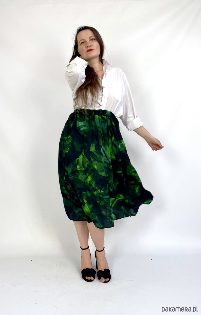 Rozkloszowany krój pięknie się kręci a głaszcząca skórę wiskoza otula Twoje ciało jak lekka chmurka tańcząc przy każdym kroku. A gumkę dopasujesz do swojej figury i podkreślisz talię.