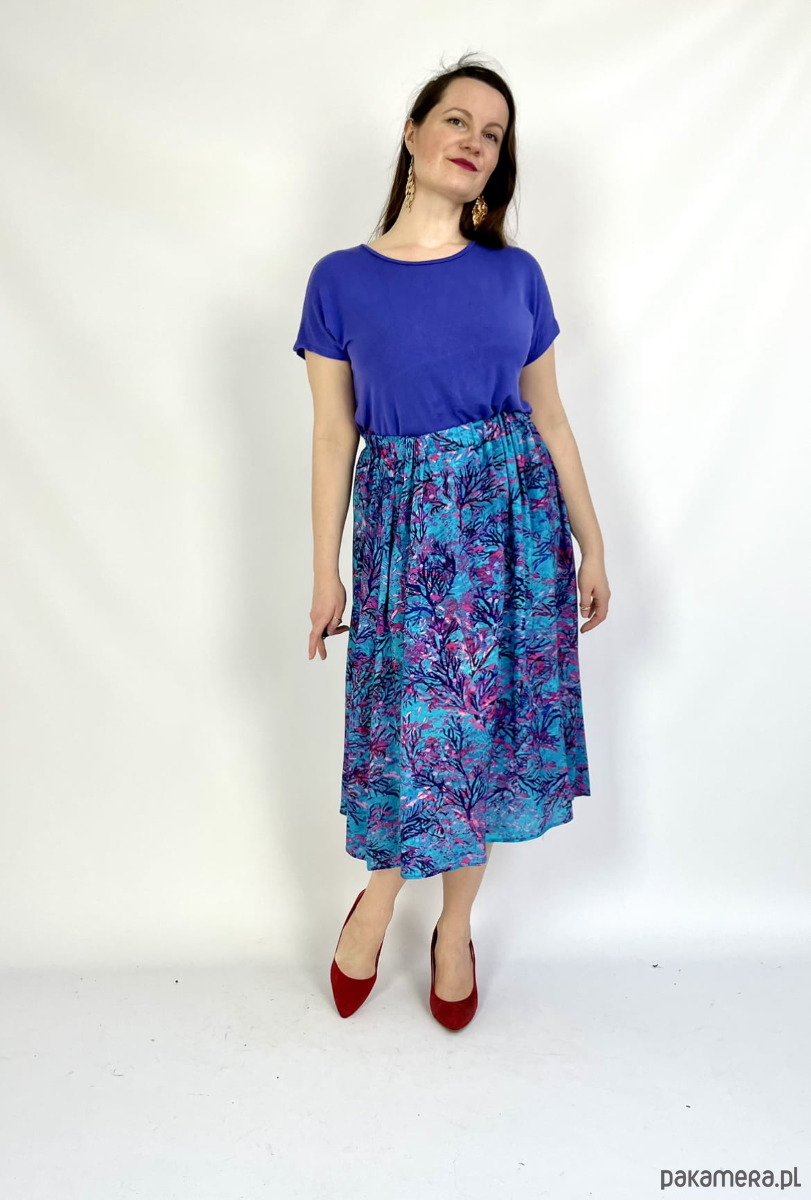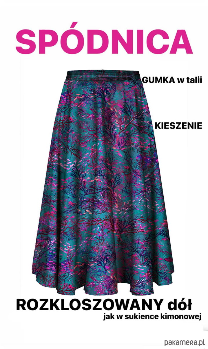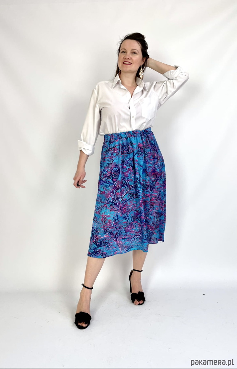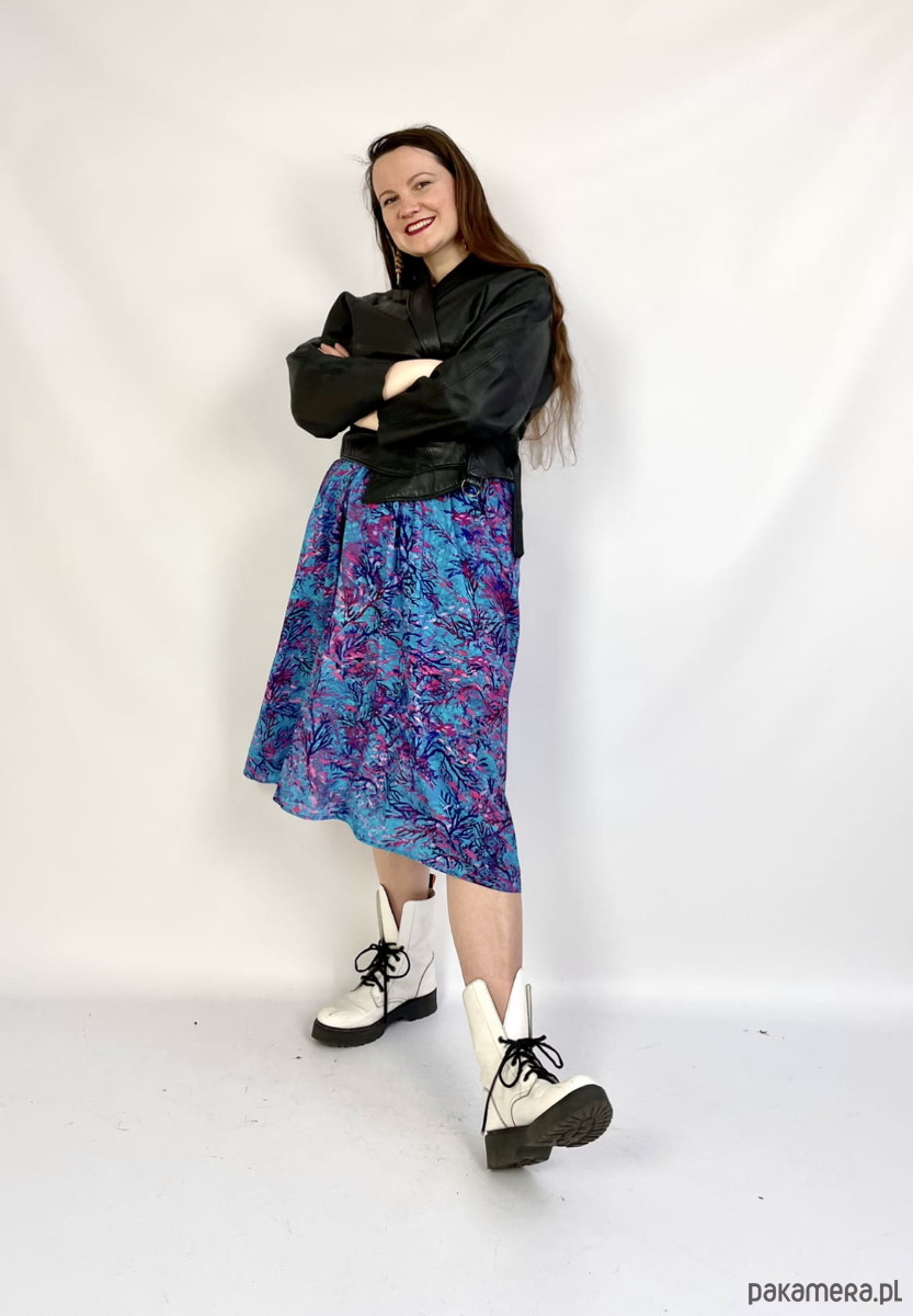 Rozkloszowany krój pięknie się kręci a głaszcząca skórę wiskoza otula Twoje ciało jak lekka chmurka tańcząc przy każdym kroku. A gumkę dopasujesz do swojej figury i podkreślisz talię.