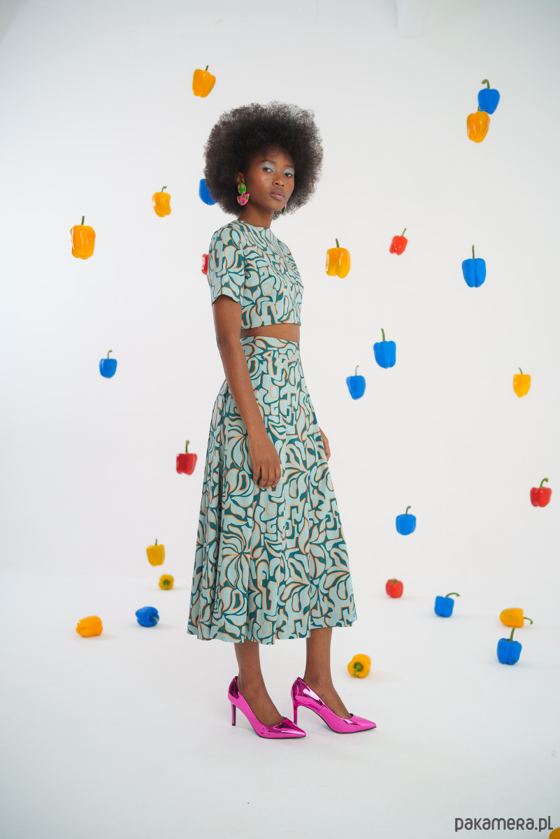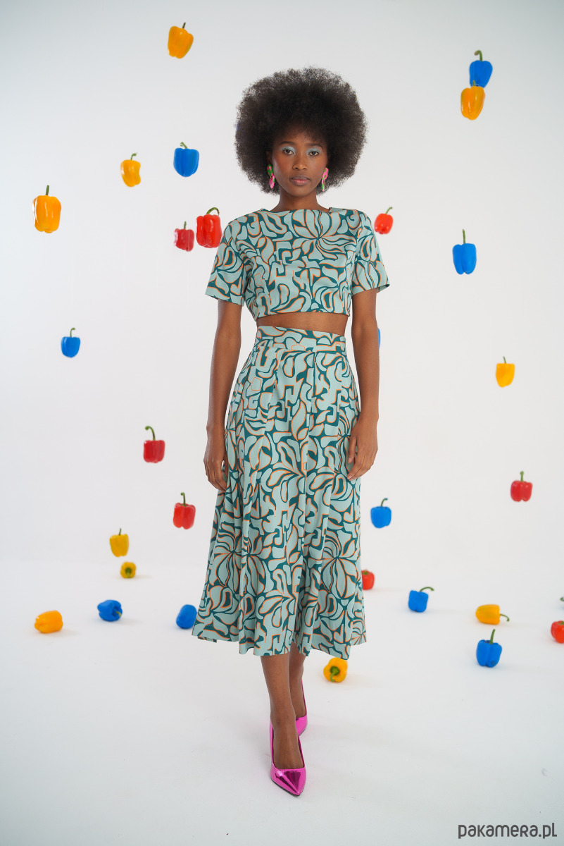 Wykonana z przewiewnego materiału, oryginalny wzór w abstrakcyjne kształty nadaje jej unikalnego charakteru. Długość midi sprawia, że jest idealna na różne okazje, od casualowych spotkań po bardziej formalne wyjścia.