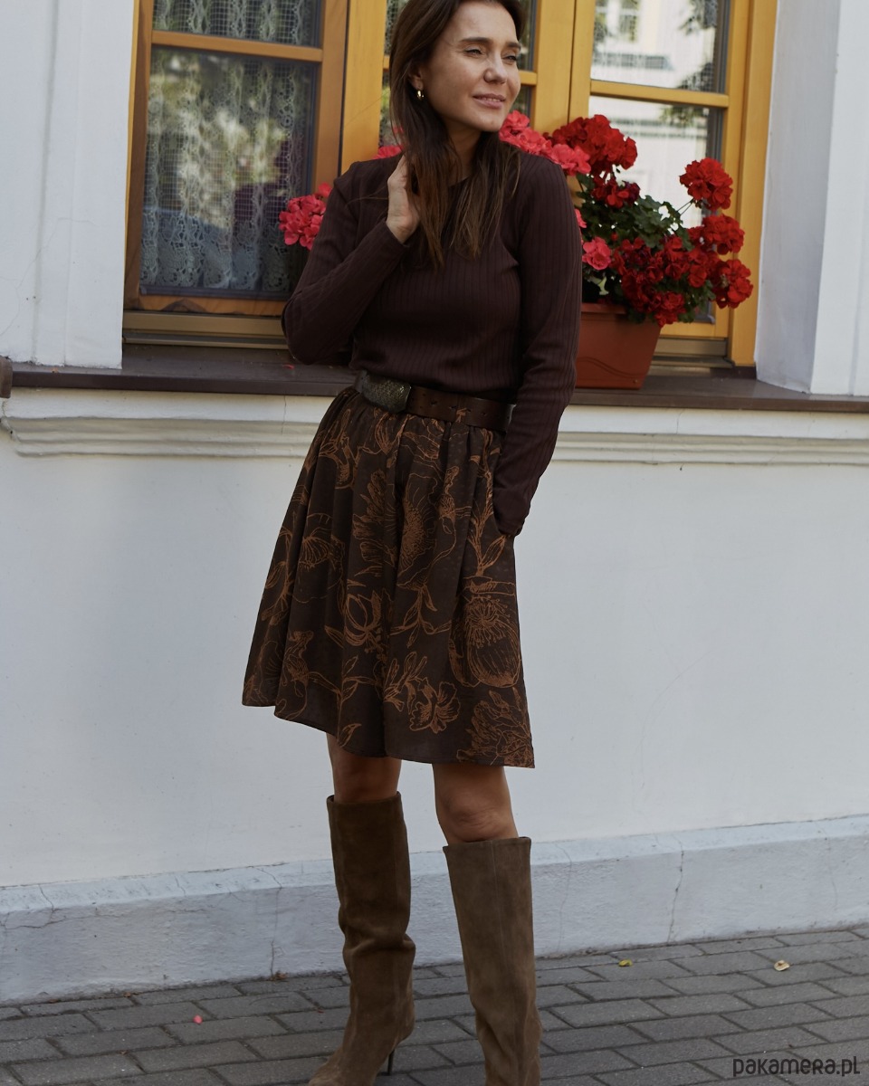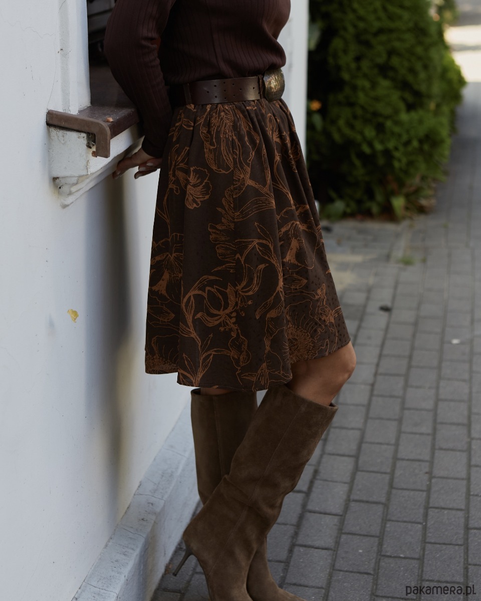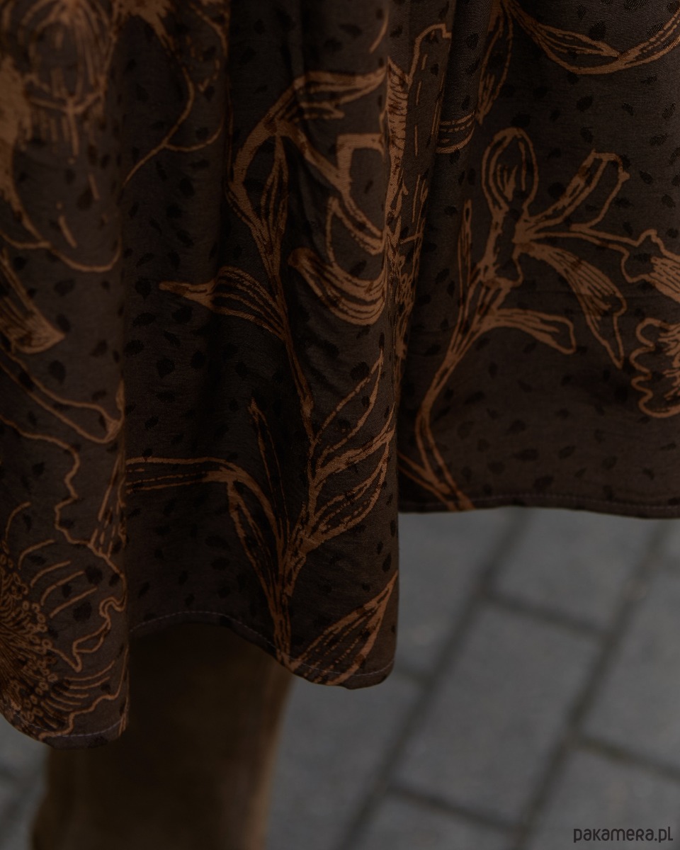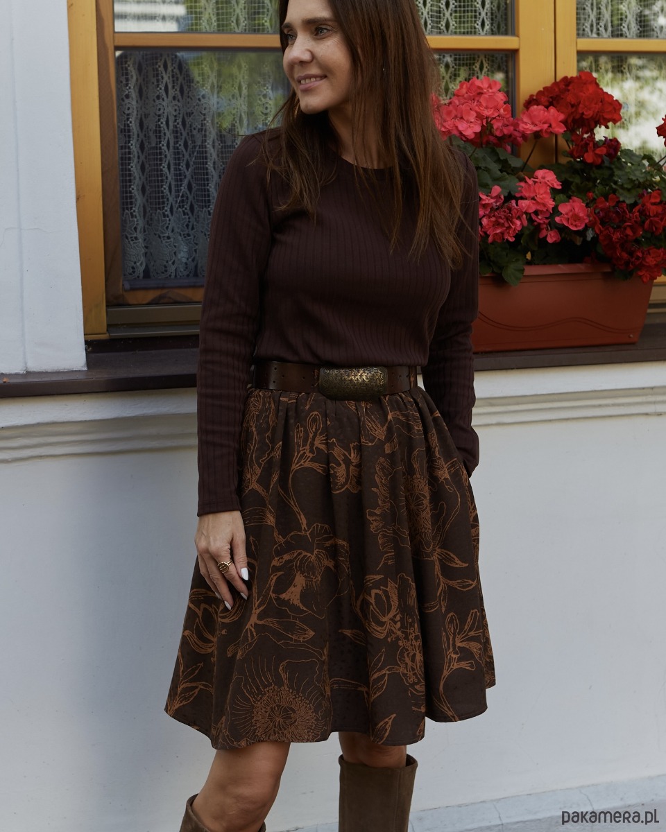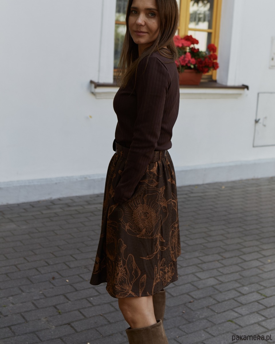 Kobieca, wiskozowa spódnica o długości przed kolano w kolorze ciemnego brązu w kamelowy wzór. Doskonale modeluje sylwetkę, akcentując talię. Dzięki wygodnej gumie dopasowuje się do rozmiaru od S do L. Dodatkowym atutem są także praktyczne kieszenie. Lekka spódnica z wiskozy jest doskonałym wyborem na każdą porę roku. Świetnie komponuje się zarówno z botkami, kozakami, jak i butami sportowymi. Łączona jest też ze szpilkami oraz oficerkami. Występuje w jednym rozmiarze. Spódnica Adara to model, który pomoże Ci wydobyć Twój naturalny blask. Uszyta w Polsce, w kameralnej pracowni na warszawskiej Pradze.