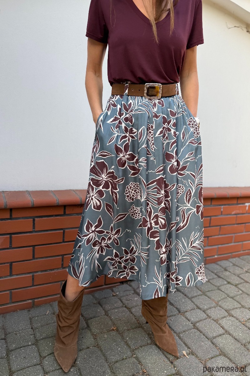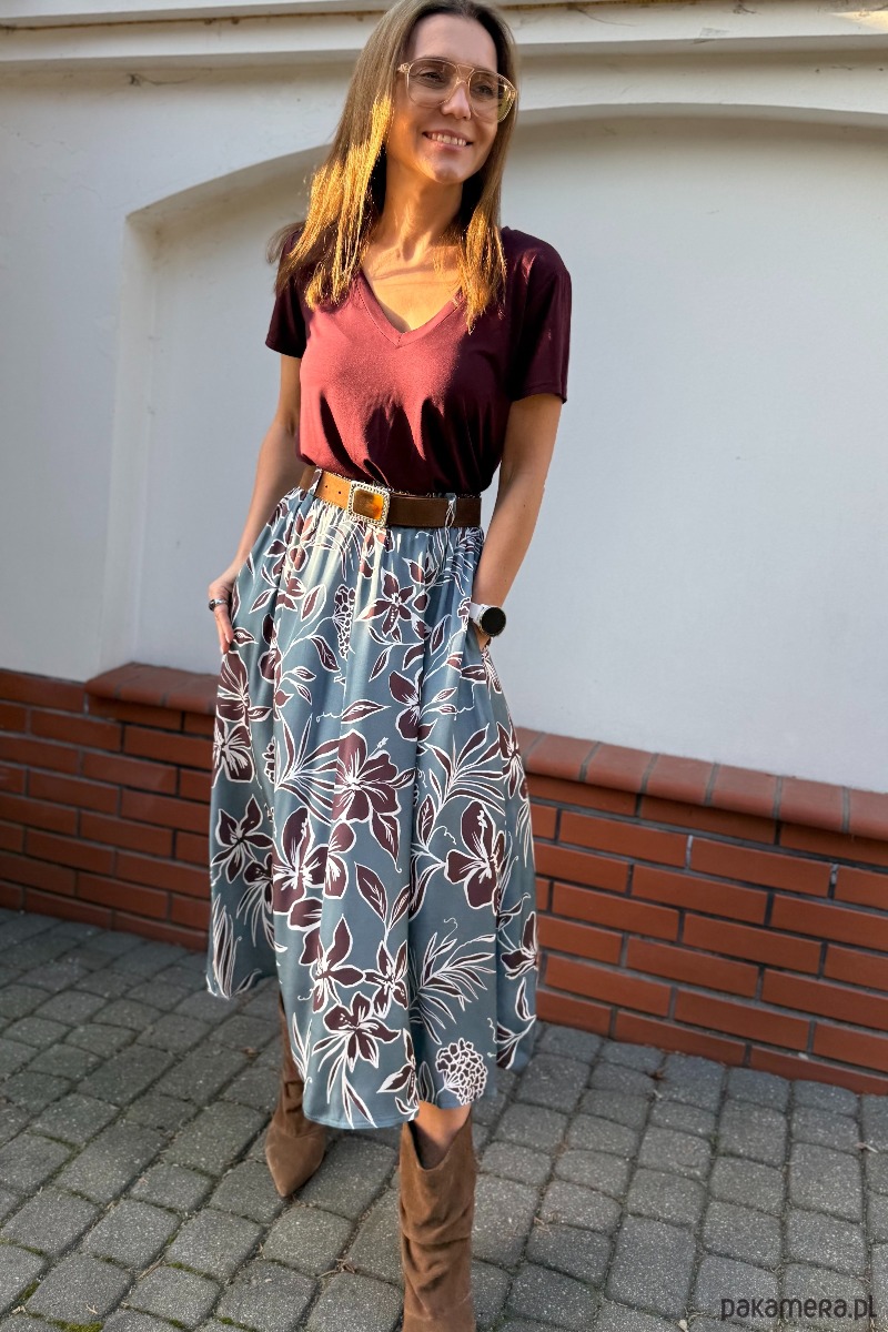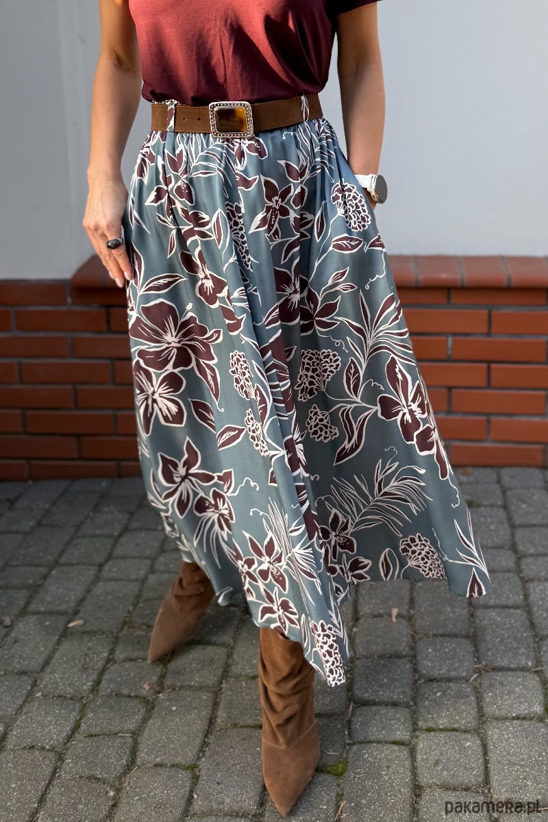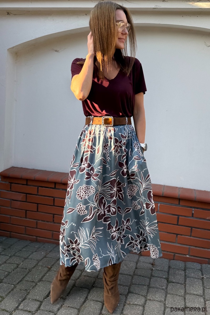 Kobieca, wiskozowa spódnica o długości midi w kolorze stalowego błękitu w kwiatowy print w kolorze brązowo/śliwkowym. Doskonale modeluje sylwetkę, akcentując talię. Dzięki wygodnej gumie dopasowuje się do rozmiaru od S do L. Dodatkowym atutem są także praktyczne kieszenie. Lekka spódnica z wiskozy jest doskonałym wyborem na każdą porę roku. Świetnie komponuje się zarówno z botkami, klapkami jak i butami sportowymi. Spódnica Adara to model, który pomoże Ci wydobyć Twój naturalny blask. Uszyta w Polsce, w kameralnej pracowni na warszawskiej Pradze. Pasek jest częścią stylizacji i nie jest sprzedawany w komplecie ze spódnicą.