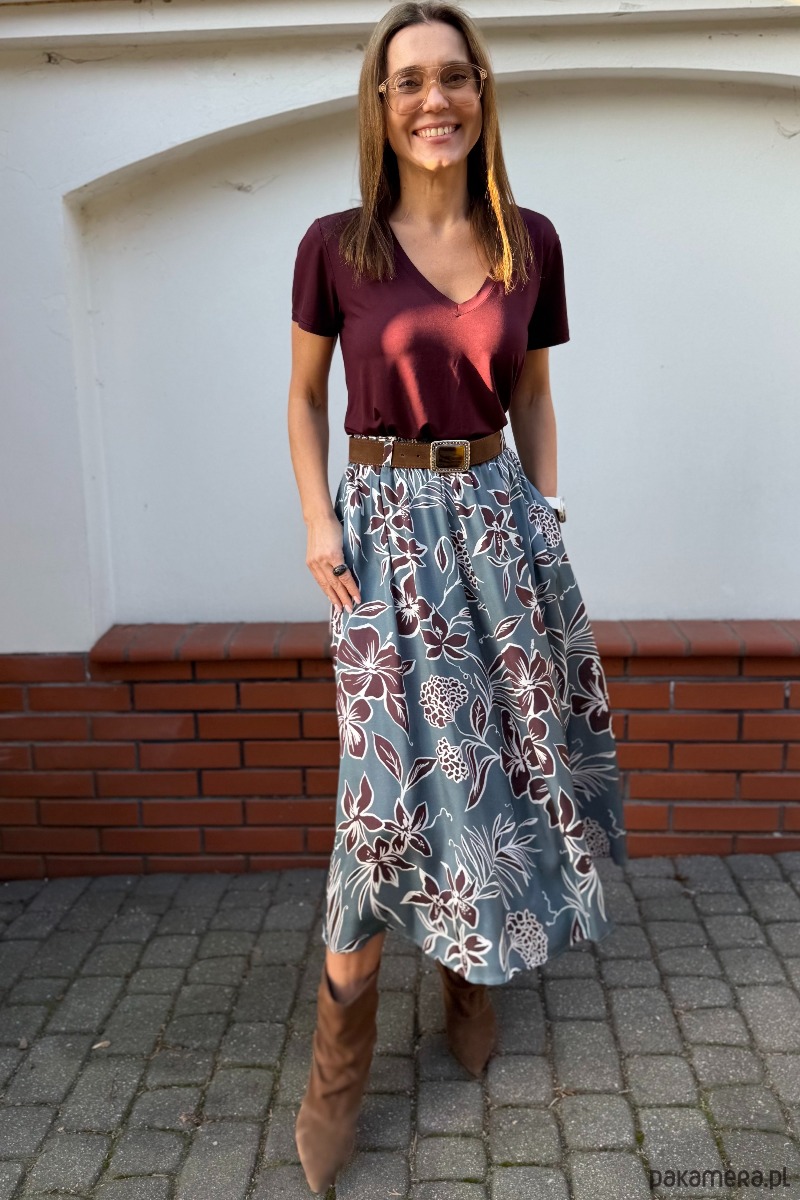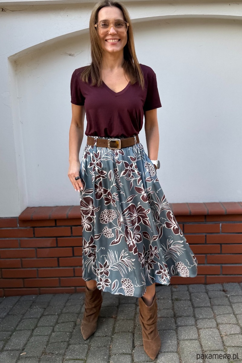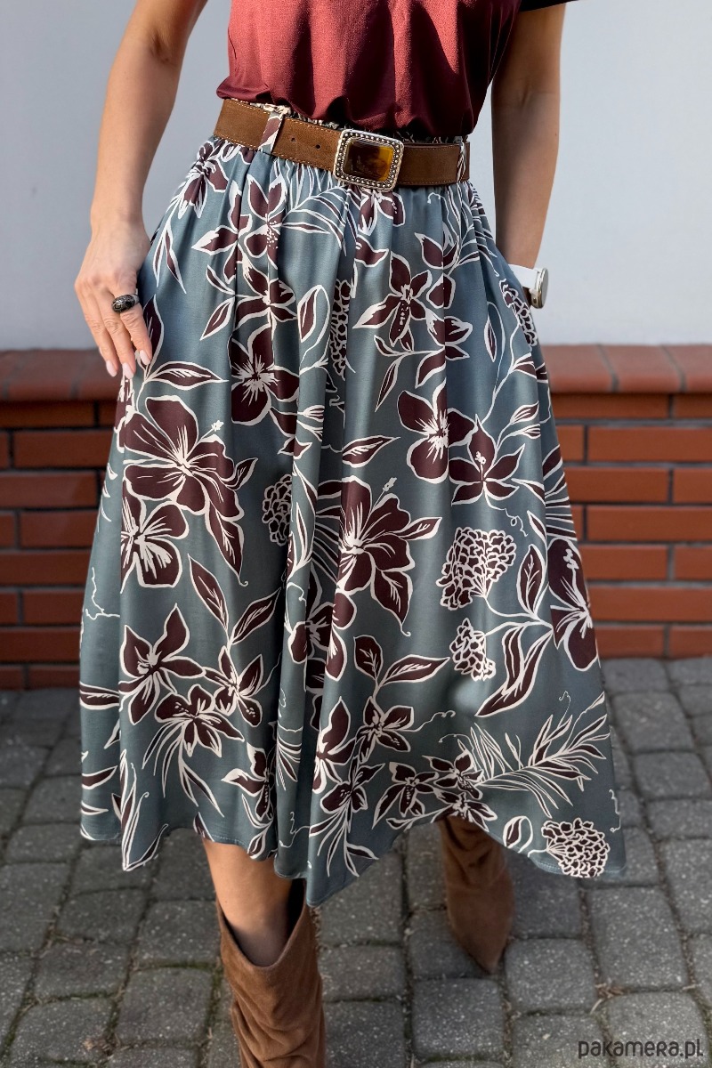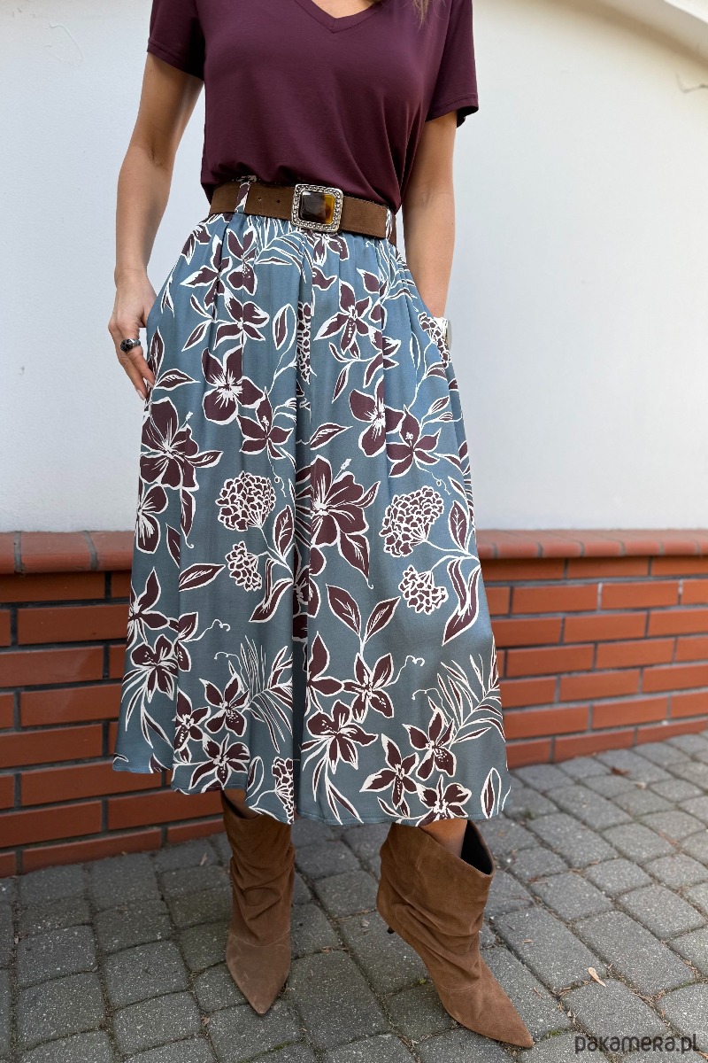 Kobieca, wiskozowa spódnica o długości midi w kolorze stalowego błękitu w kwiatowy print w kolorze brązowo/śliwkowym. Doskonale modeluje sylwetkę, akcentując talię. Dzięki wygodnej gumie dopasowuje się do rozmiaru od S do L. Dodatkowym atutem są także praktyczne kieszenie. Lekka spódnica z wiskozy jest doskonałym wyborem na każdą porę roku. Świetnie komponuje się zarówno z botkami, klapkami jak i butami sportowymi. Spódnica Adara to model, który pomoże Ci wydobyć Twój naturalny blask. Uszyta w Polsce, w kameralnej pracowni na warszawskiej Pradze. Pasek jest częścią stylizacji i nie jest sprzedawany w komplecie ze spódnicą.