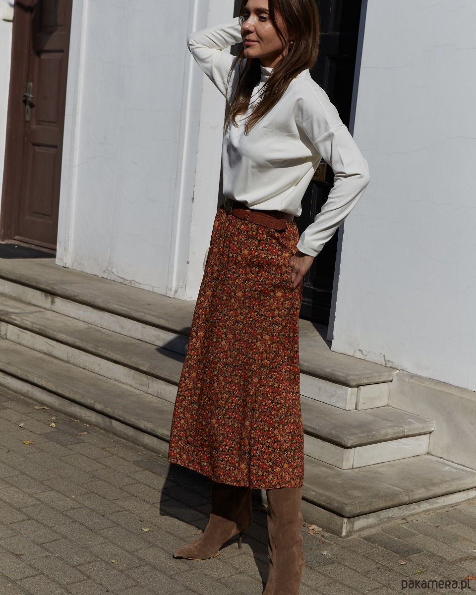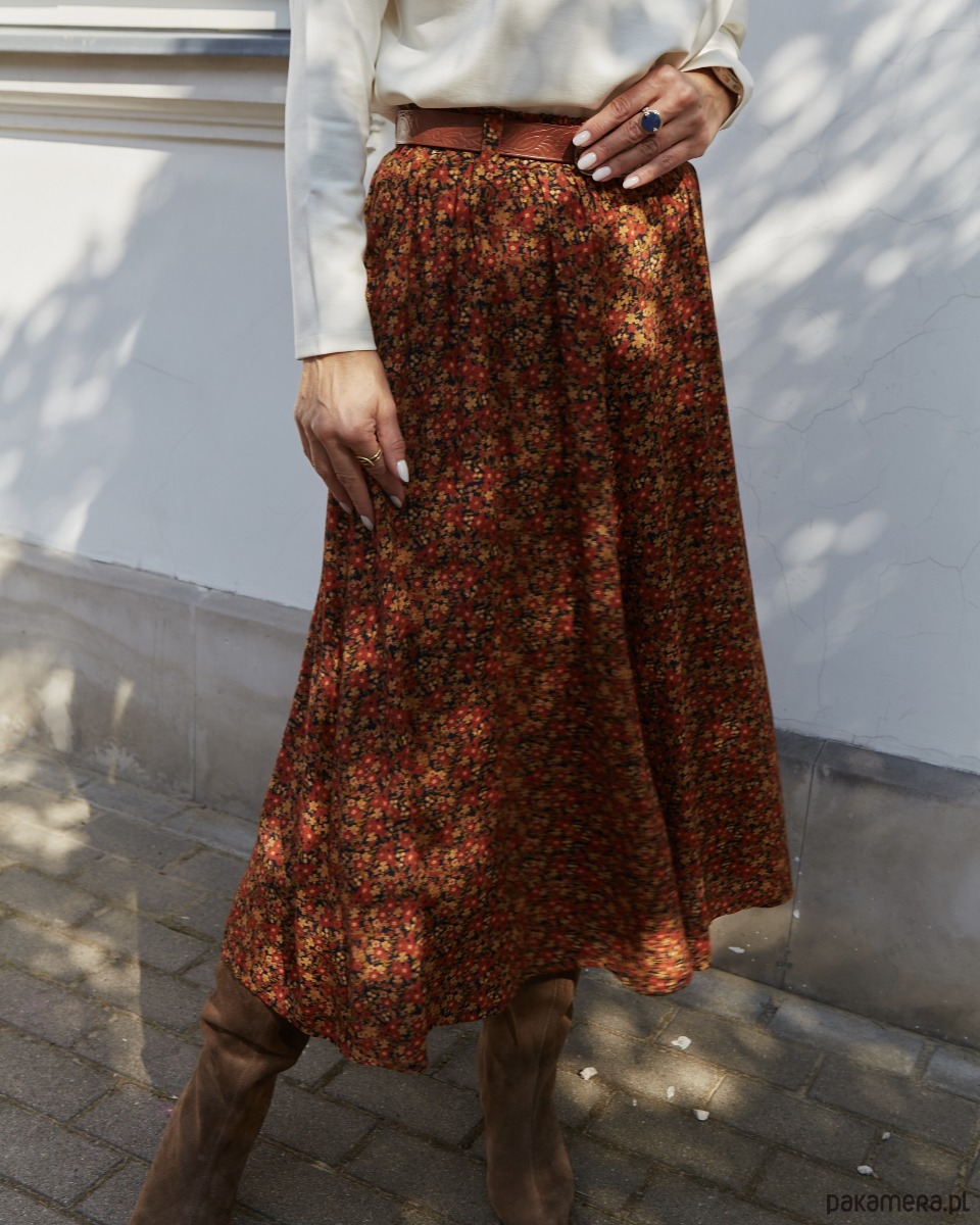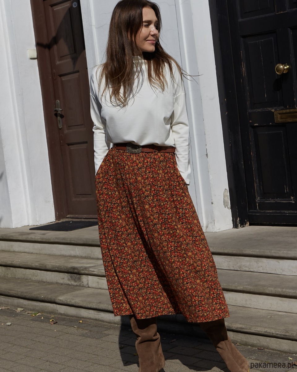 Kobieca, wiskozowa spódnica o długości midi w drobny, kwiatowy wzór w przepięknych kolorach jesieni. Doskonale modeluje sylwetkę, akcentując talię. Dzięki wygodnej gumie dopasowuje się do rozmiaru od S do L. Dodatkowym atutem są także praktyczne kieszenie. Lekka spódnica z wiskozy jest doskonałym wyborem na każdą porę roku. Świetnie komponuje się zarówno z botkami, kozakami, jak i butami sportowymi. Łączona jest też ze szpilkami oraz oficerkami. Spódnica Adara to model, który pomoże Ci wydobyć Twój naturalny blask. Uszyta w Polsce, w kameralnej pracowni na warszawskiej Pradze.