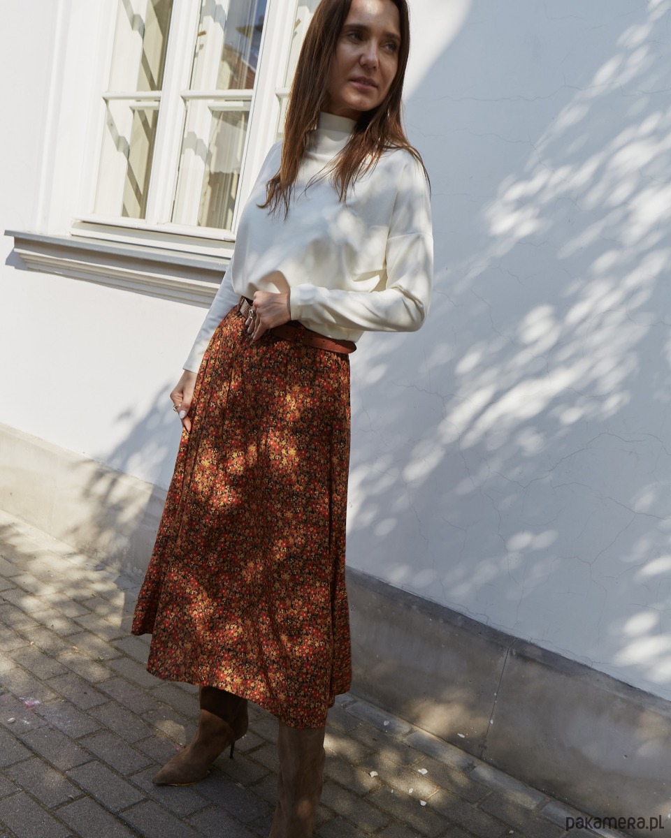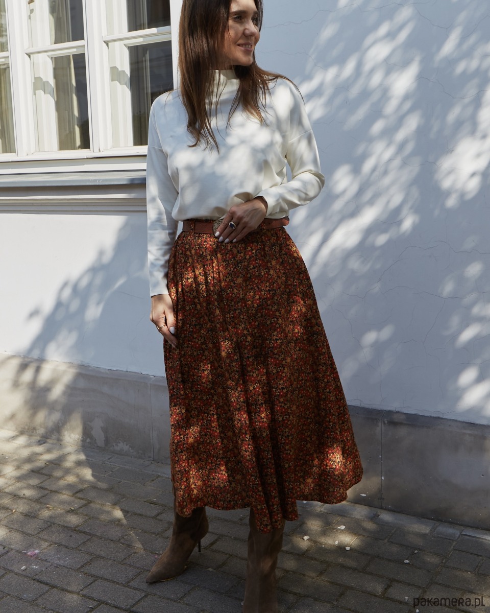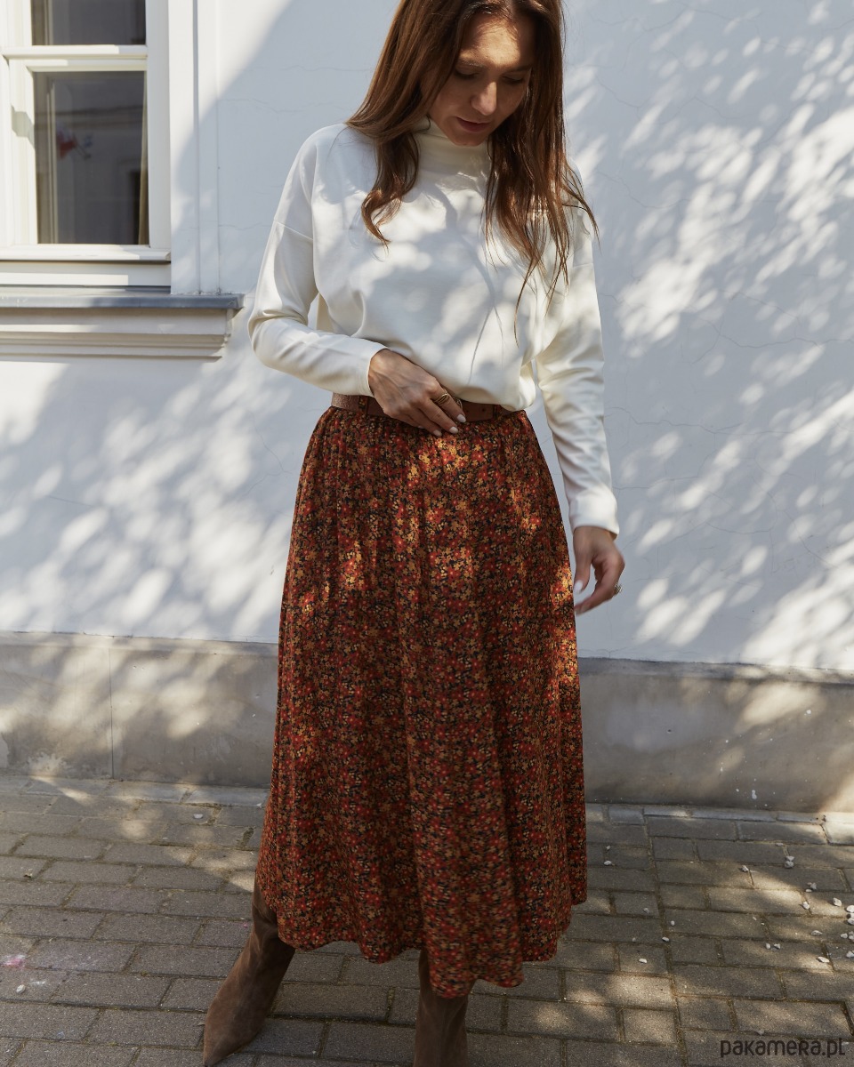 Kobieca, wiskozowa spódnica o długości midi w drobny, kwiatowy wzór w przepięknych kolorach jesieni. Doskonale modeluje sylwetkę, akcentując talię. Dzięki wygodnej gumie dopasowuje się do rozmiaru od S do L. Dodatkowym atutem są także praktyczne kieszenie. Lekka spódnica z wiskozy jest doskonałym wyborem na każdą porę roku. Świetnie komponuje się zarówno z botkami, kozakami, jak i butami sportowymi. Łączona jest też ze szpilkami oraz oficerkami. Spódnica Adara to model, który pomoże Ci wydobyć Twój naturalny blask. Uszyta w Polsce, w kameralnej pracowni na warszawskiej Pradze.