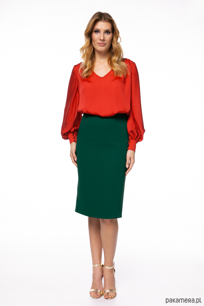 Spódnica midi o fasonie ołówkowym uszyta z pięknej i szlachetnej tkaniny w kolorze ciemnej zieleni, na wiskozowej podszewce. Materiały nie są elastyczne.