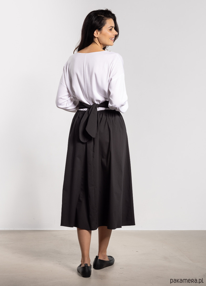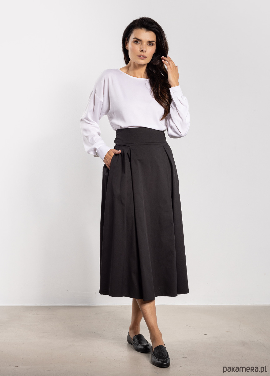 Spódnica midi z wysokim stanem to ponadczasowy model, który sprawdzi się zarówno w pracy, jak i podczas codziennych wyjść. Wysoki pas pięknie podkreśla talię i optycznie wydłuża sylwetkę, a dekoracyjne wiązanie z tyłu dodaje kobiecego uroku. Rozkloszowany dół układa się lekko przy każdym ruchu, wprowadzając do stylizacji swobodę i lekkość. Minimalistyczny fason i długość za kolano sprawiają, że spódnica doskonale komponuje się z elegancką koszulą, prostym topem czy swetrem, będąc uniwersalną bazą wielu stylizacji.