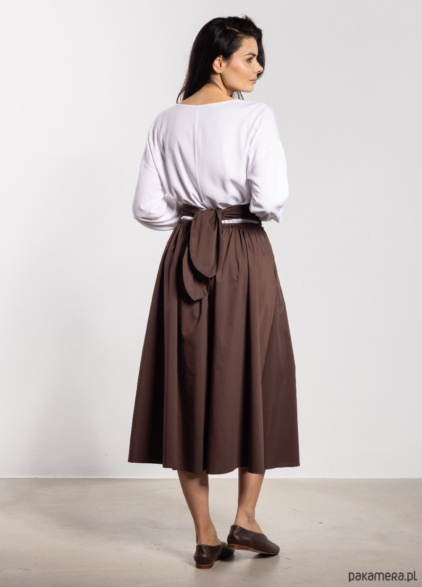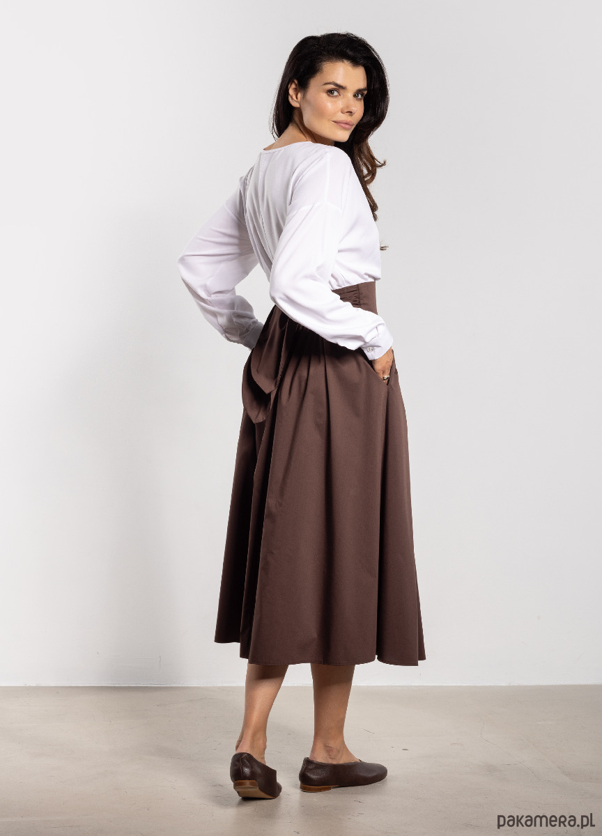 Spódnica midi z wysokim stanem to ponadczasowy model, który sprawdzi się zarówno w pracy, jak i podczas codziennych wyjść. Wysoki pas pięknie podkreśla talię i optycznie wydłuża sylwetkę, a dekoracyjne wiązanie z tyłu dodaje kobiecego uroku. Rozkloszowany dół układa się lekko przy każdym ruchu, wprowadzając do stylizacji swobodę i lekkość. Minimalistyczny fason i długość za kolano sprawiają, że spódnica doskonale komponuje się z elegancką koszulą, prostym topem czy swetrem, będąc uniwersalną bazą wielu stylizacji.