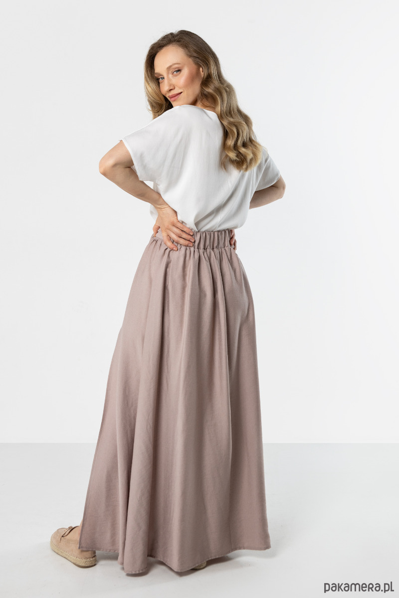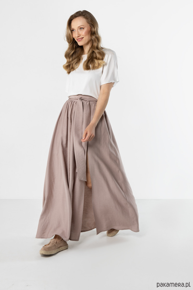 Długa spódnica w kaszmirowym odcieniu o lekkim, rozkloszowanym kroju. Model z elastyczną gumką w pasie i wiązaniem pięknie podkreśla talię, a wysokie rozcięcie dodaje sylwetce lekkości i kobiecego charakteru. Doskonała zarówno na co dzień, jak i na bardziej eleganckie okazje.