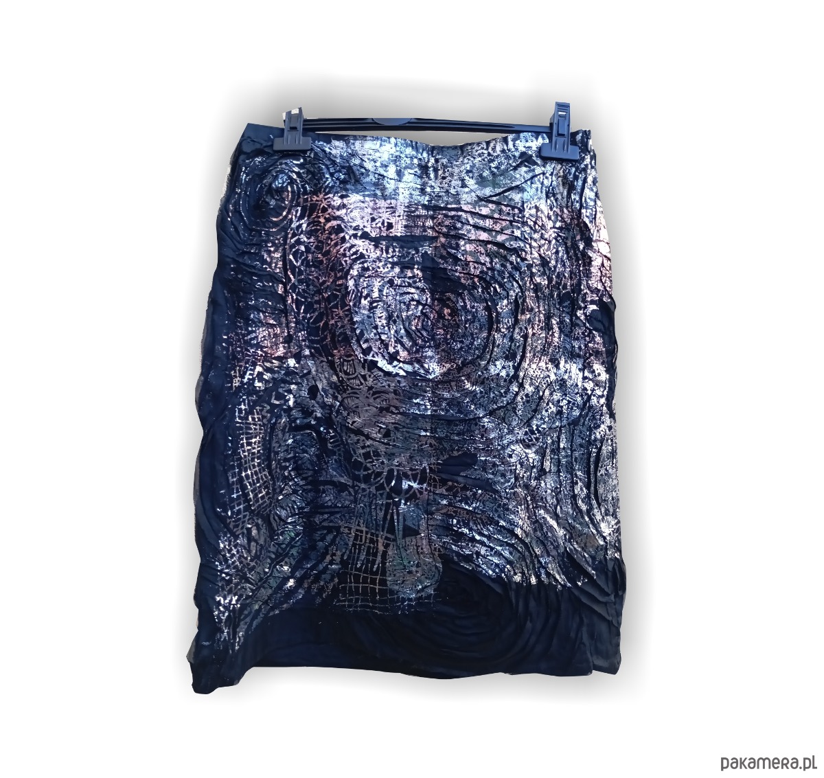 Unikatowa spódnica stworzona w duchu upcyklingu – wykonana z odzyskanej tkaniny o pięknym, głębokim odcieniu granatu. Każdy egzemplarz został ręcznie zdobiony techniką sitodruku artystycznego, przy użyciu autorskiego wzoru inspirowanego koronką karkonoską.